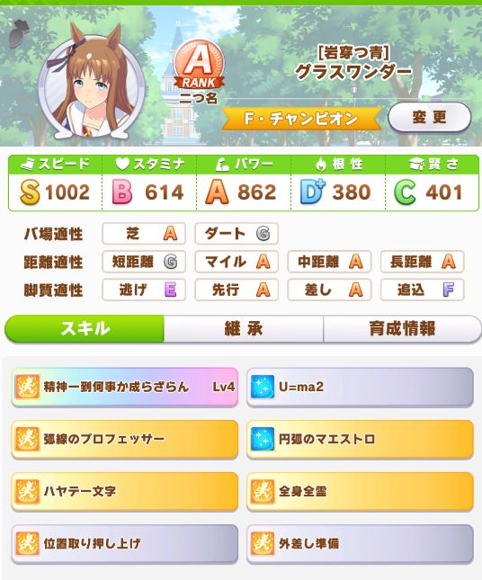 前回はマイルを走らせるにはイマイチなステータスだったので、差し脚質でそこそこのステータスに出来た印象。