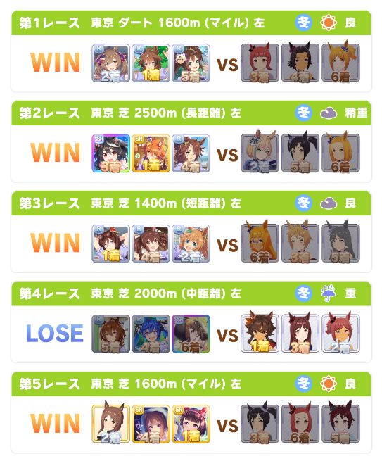 以下マチタン、ヒーラーグラス、相手のゴルシ、フク、ゴルシ、ネイチャ、クリーク、オペラオーという結果に。