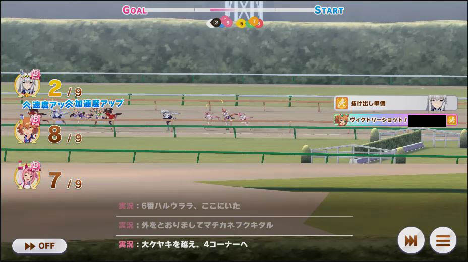 逃げ1人(エル)先行4人(オグリ、エル、タイキ、和服シチー)差し3人(ウララ、フク、オグリ)追い込み1人(ウララ)