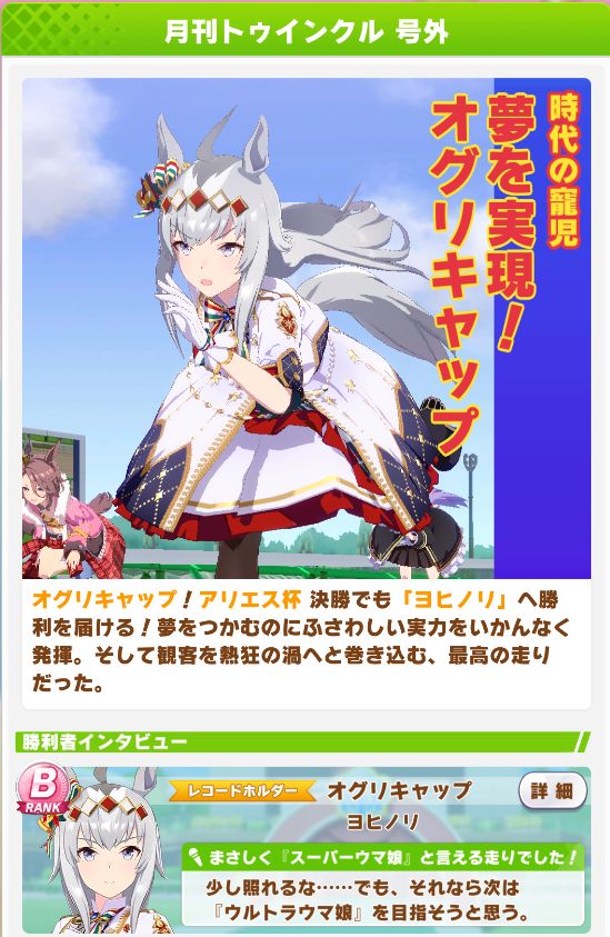 以下カワカミ、タイシン、アルダン、マック、相手のクリスマスオグリ、フク、チョコボンという結果に。