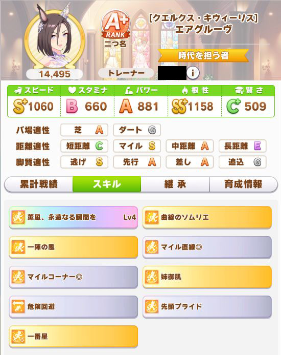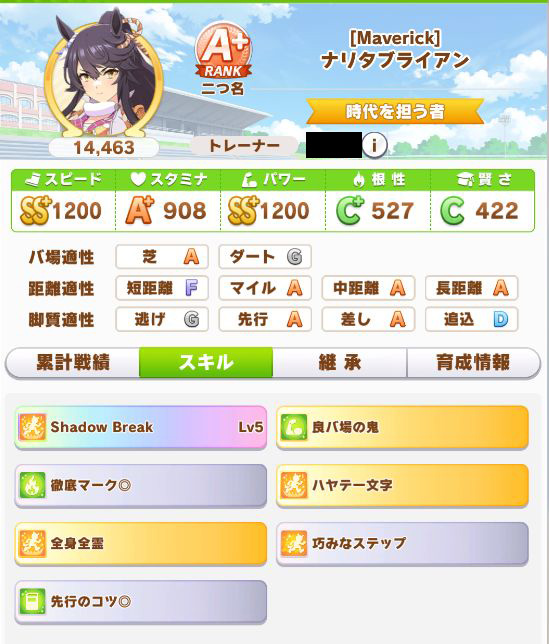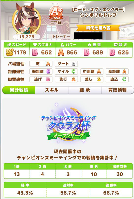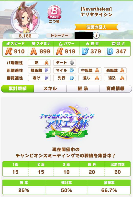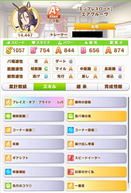 緑スキルを入れずに育成した、汎用性を重視したステータスだったので