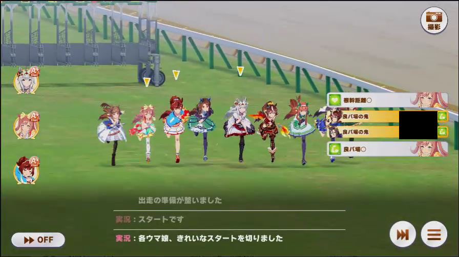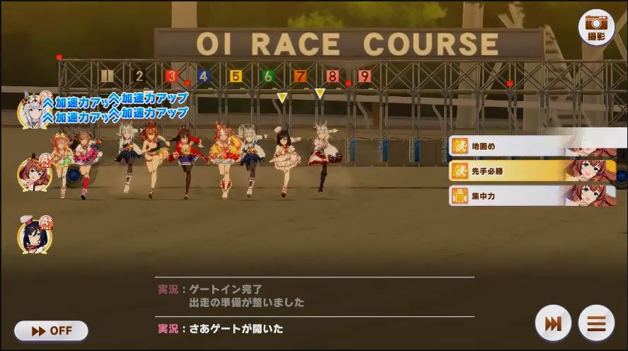 出走したウマ娘は、逃げ2(チョコブルボン、マック)先行3(クリスマスオグリ2人、アルダン)差し3(カワカミ、フクキタル、ドーベル)追込1(タイシン)と