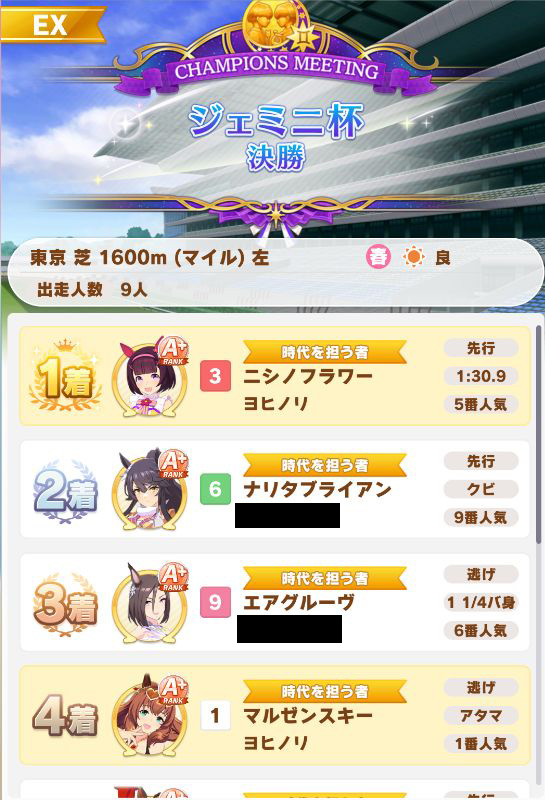 以下カワカミ、タイシン、アルダン、マック、相手のクリスマスオグリ、フク、チョコボンという結果に。