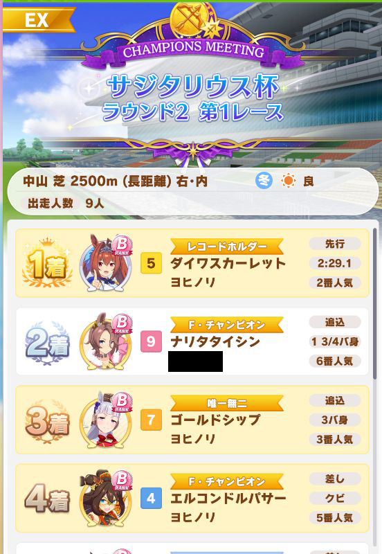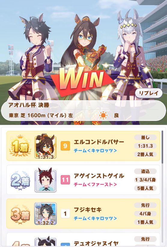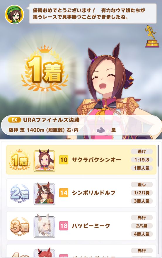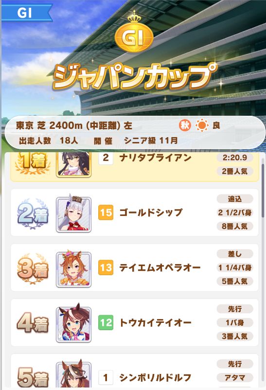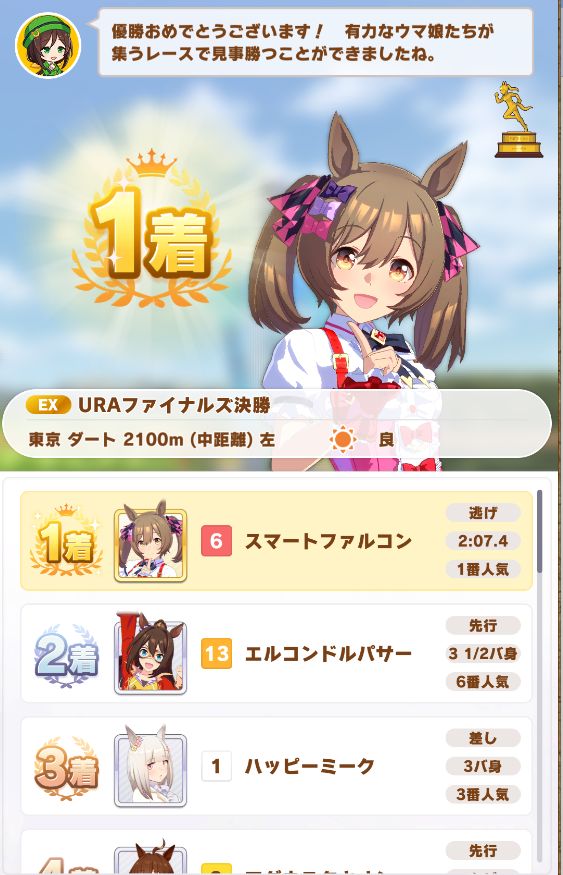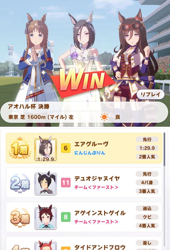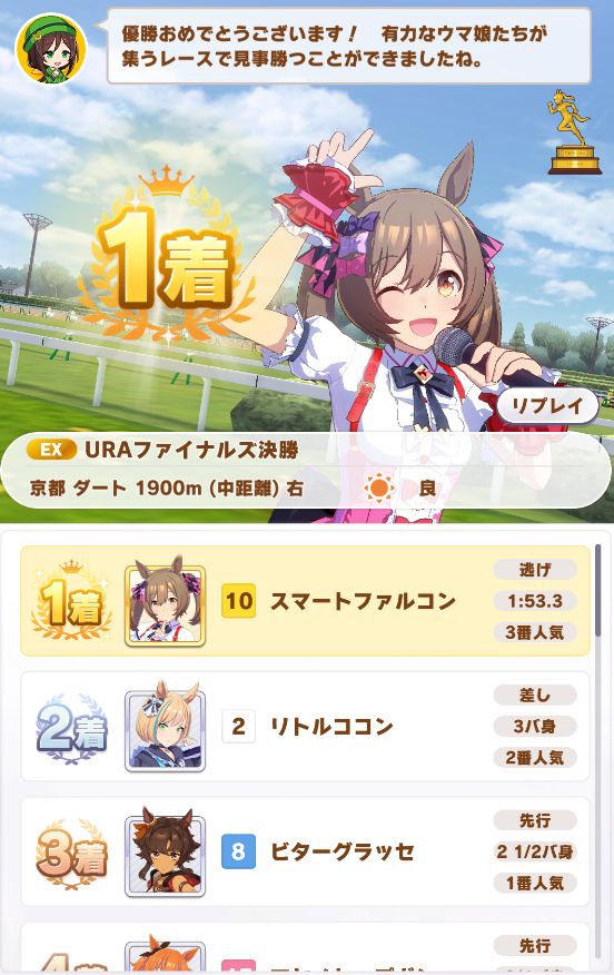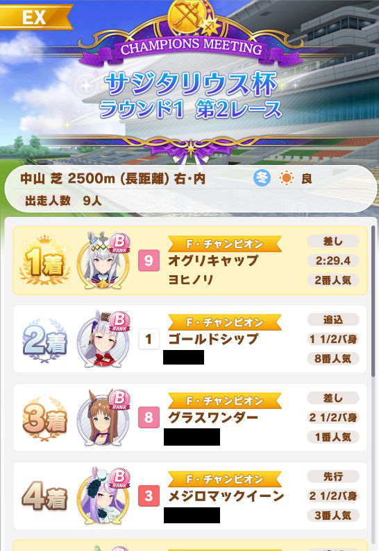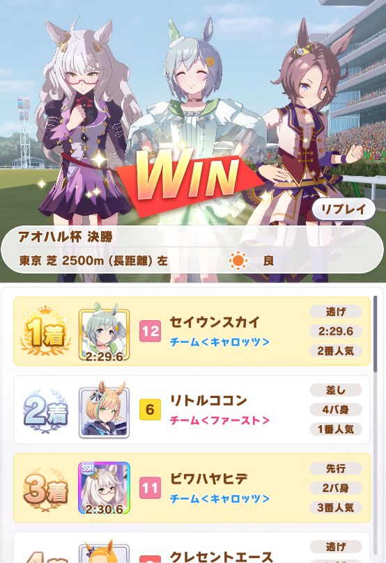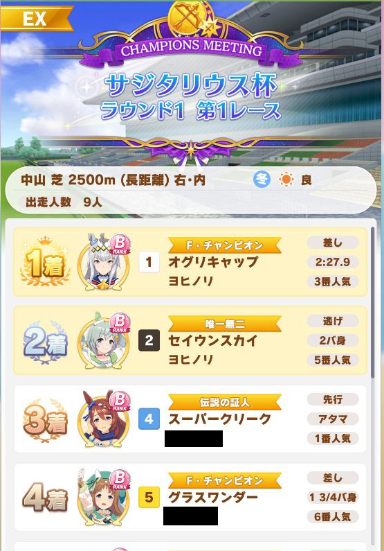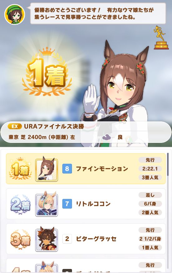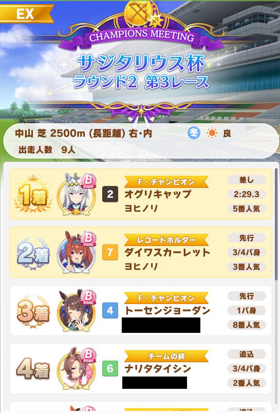 回復スキルが出なかったものの、固有を発動したオグリが勝利。