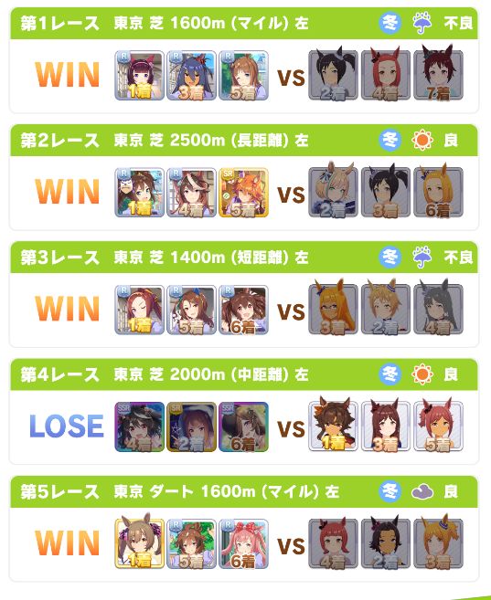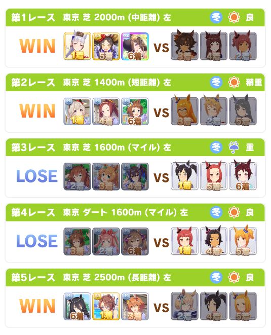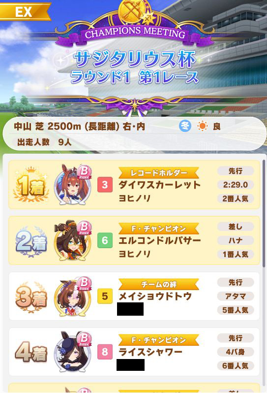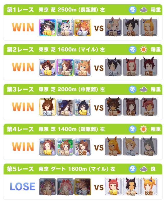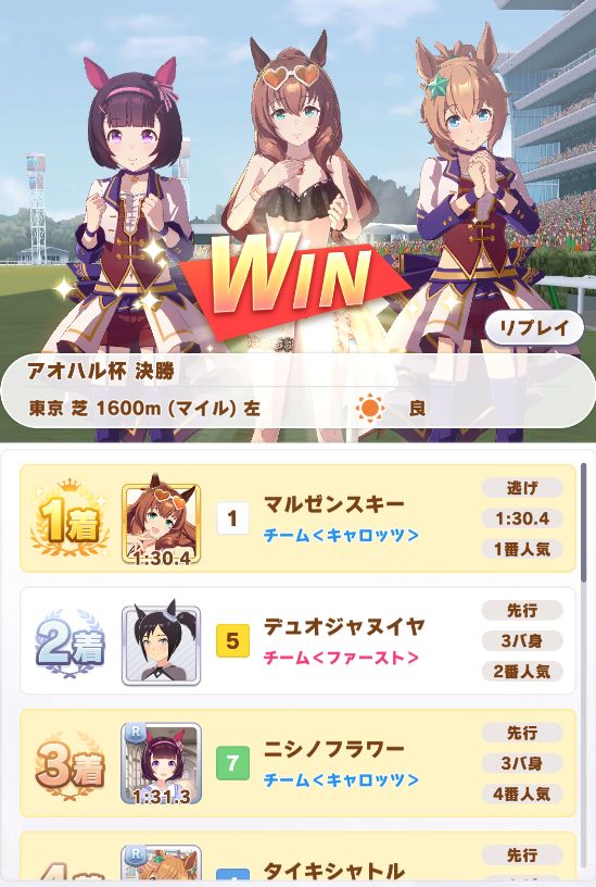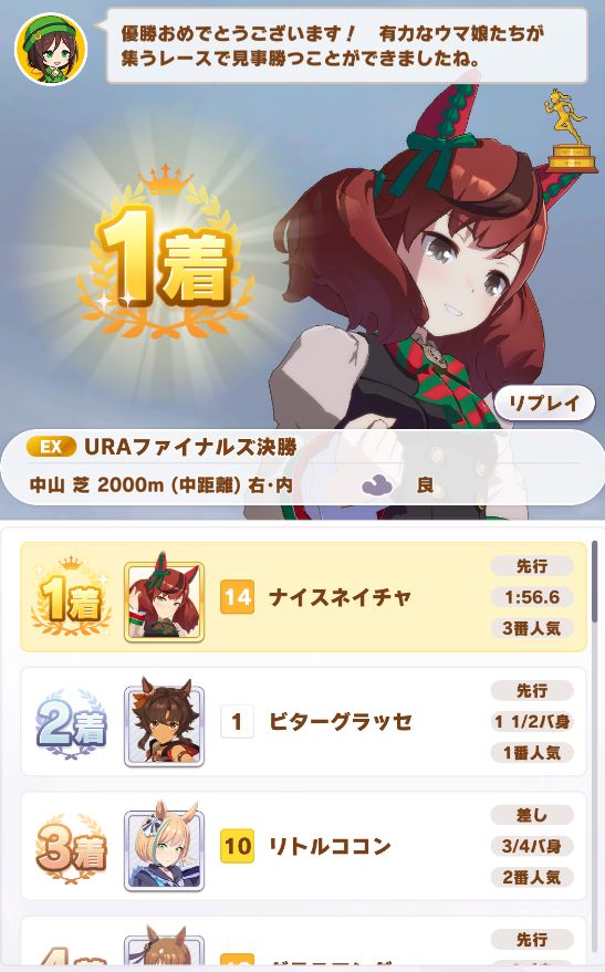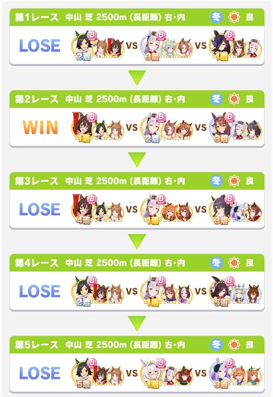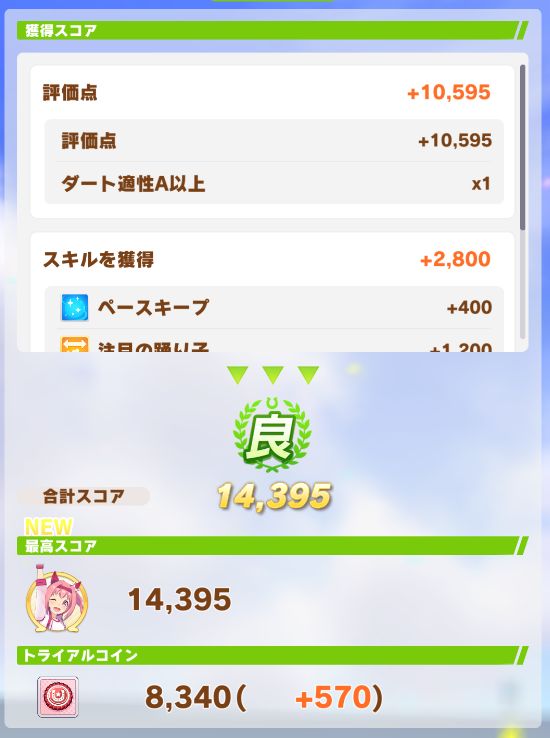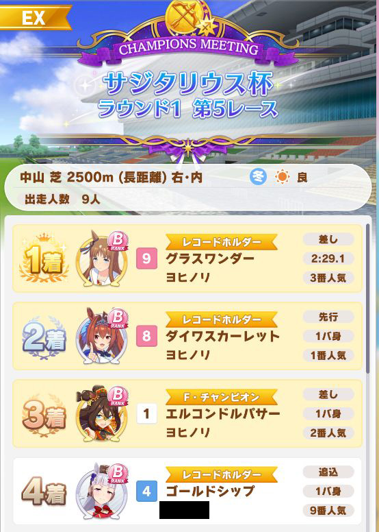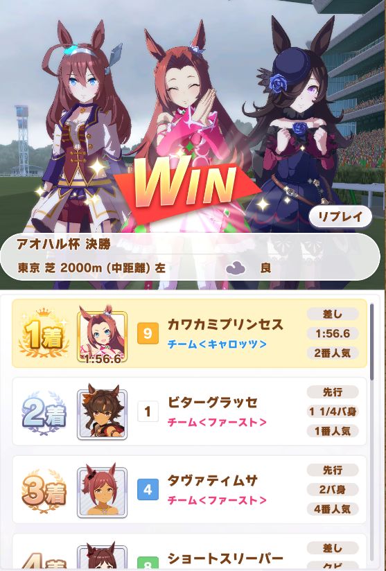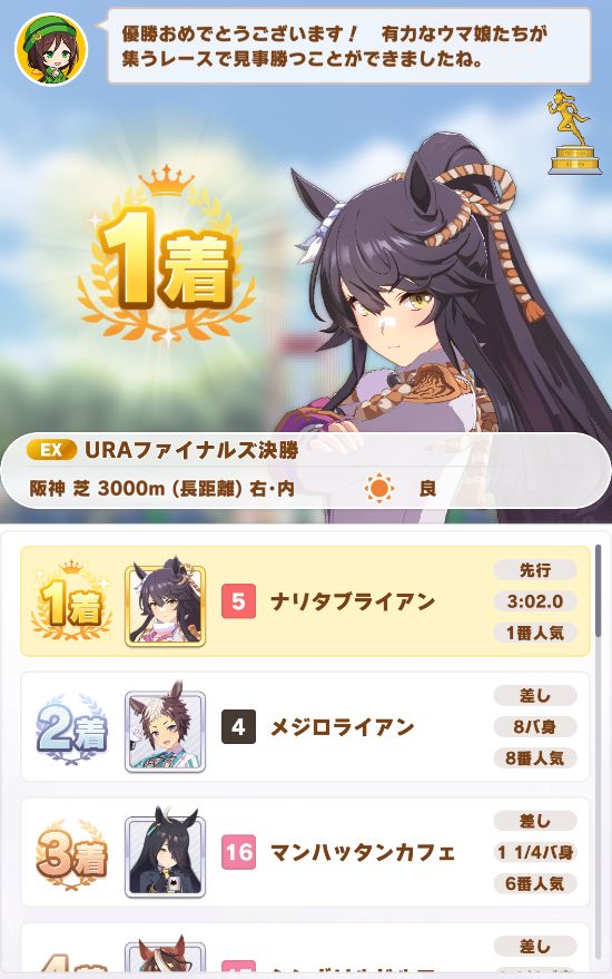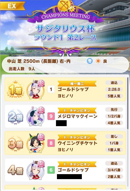 回復スキルが出なかったものの、固有を発動したオグリが勝利。