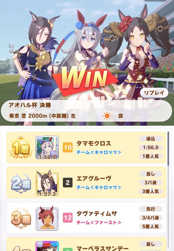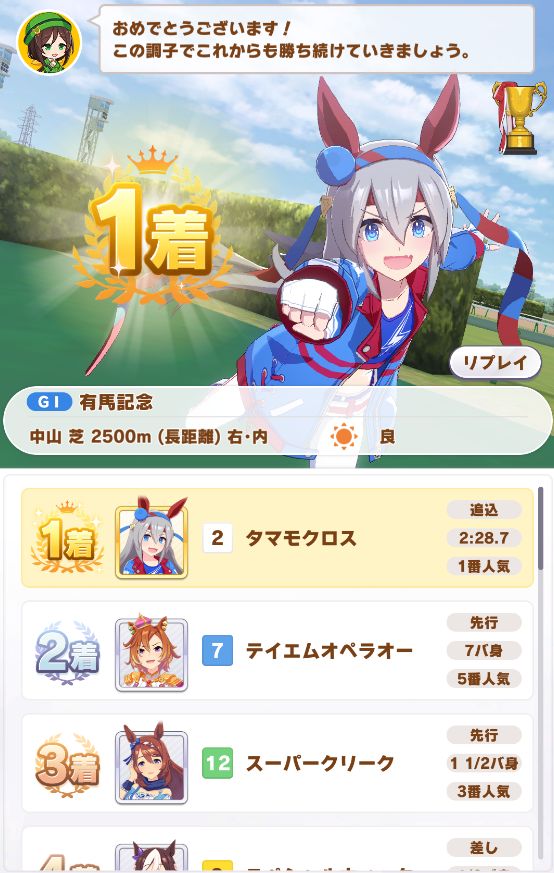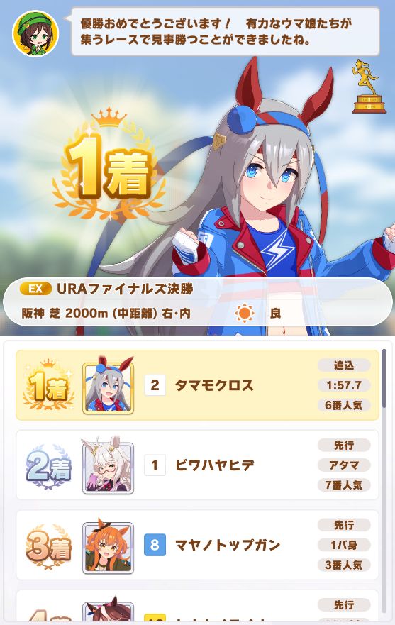 勝ったのはサジタリウス杯直後にガチャで登場したタマモクロスが早速登場