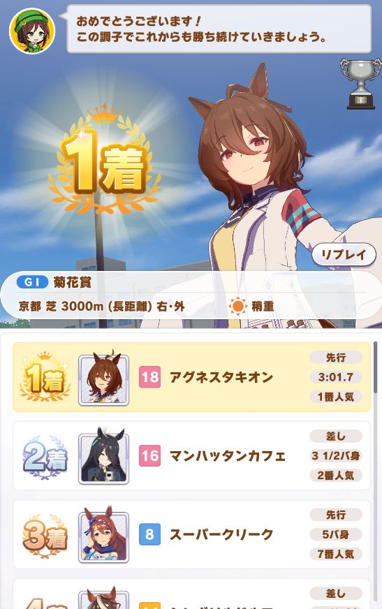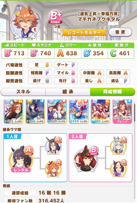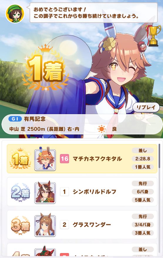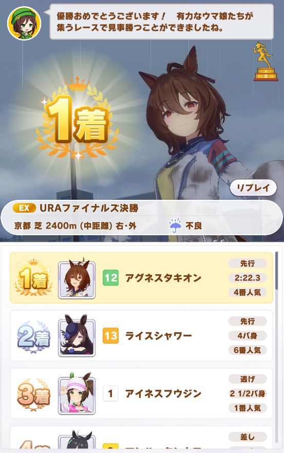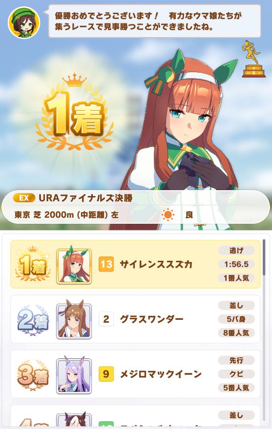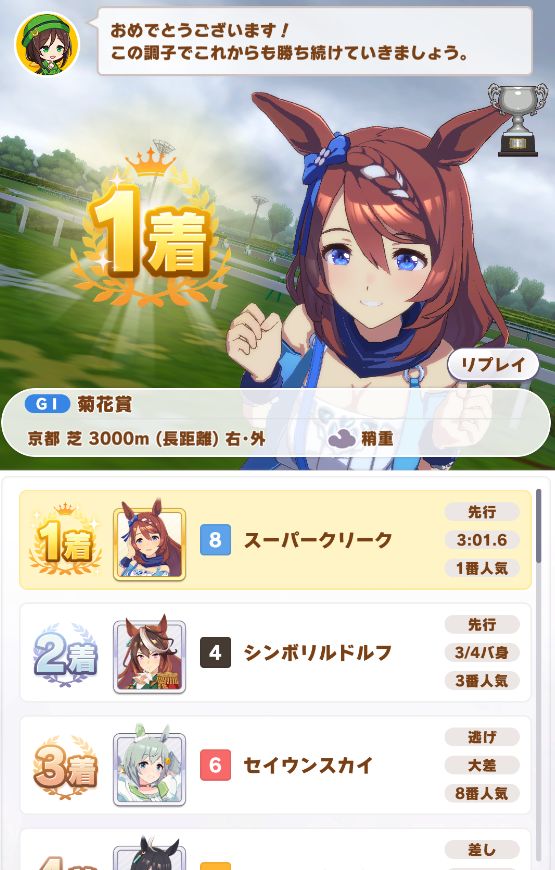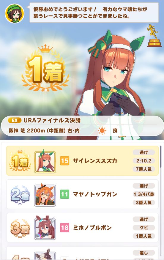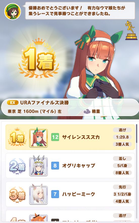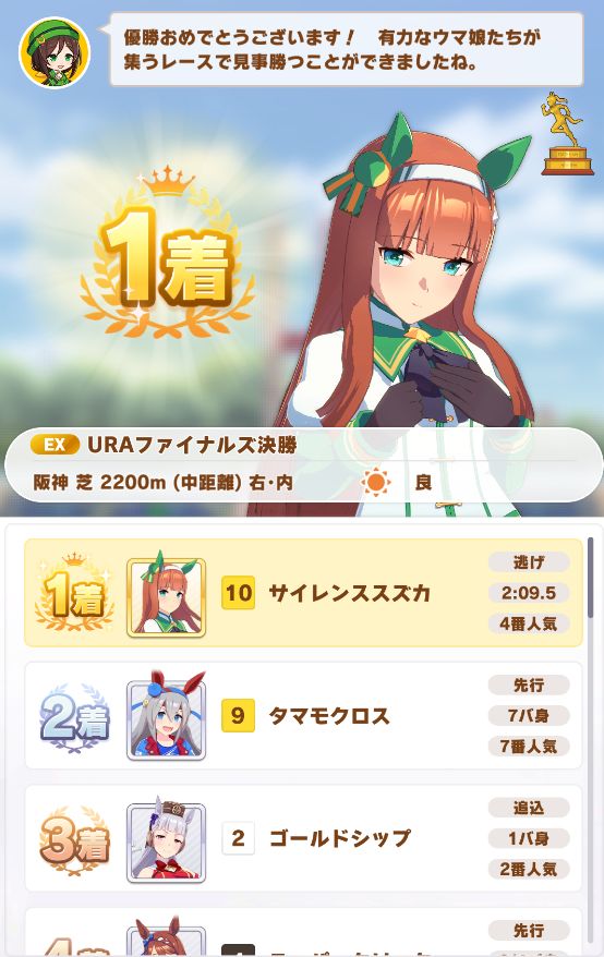 オグリ自身は末脚+固有スキルで抜け出したものの、最高速に届くのが遅かった印象。食いしん坊出ていれば…(セイちゃんはマエストロ出てた)