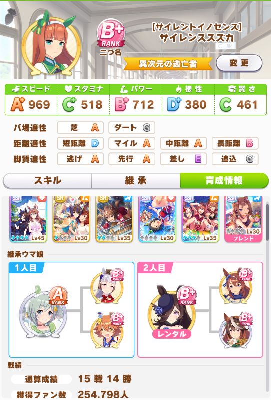 もともとセイちゃん自身育成が中長距離寄りな上に、もともと逃げ脚質のウマ娘はステータスが上振れやすいせいか、Bランクに育成させることが殊の外難易度が高く。