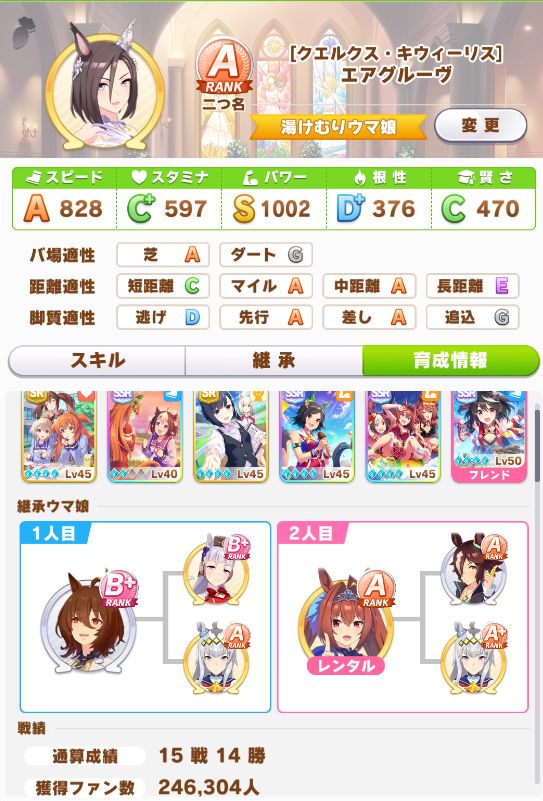 こちらはちゃんとURAまでクリアし、因子はSP3ST3賢2URA2と悪くないのだが