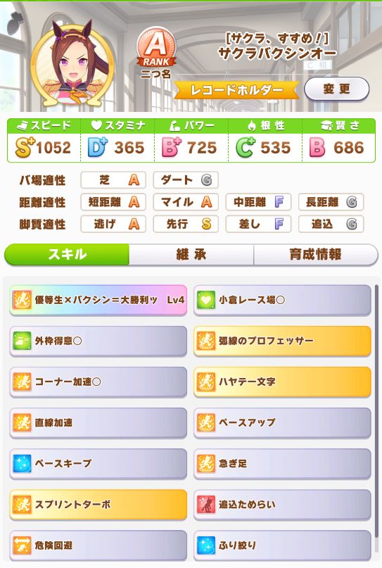 全部乗せは脚質や距離適性が合致してないので、これでURAは優勝出来てもチーム競技場向け育成には向いてないのかな