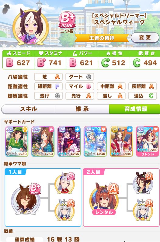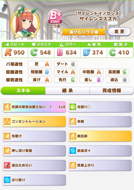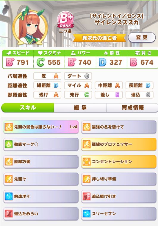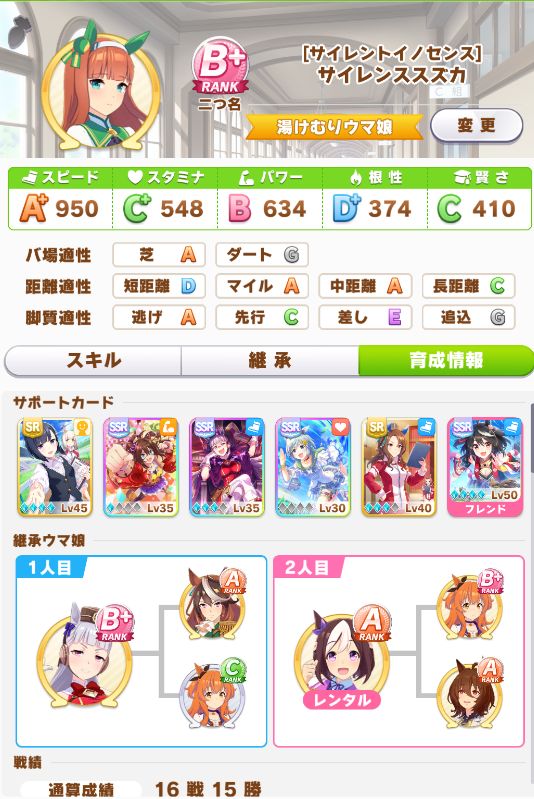 ところが、この時点でステータスは平坦過ぎて飛び抜けたものがないわ、スキルもサポカの相性が悪く、有用なのが全くないままで
