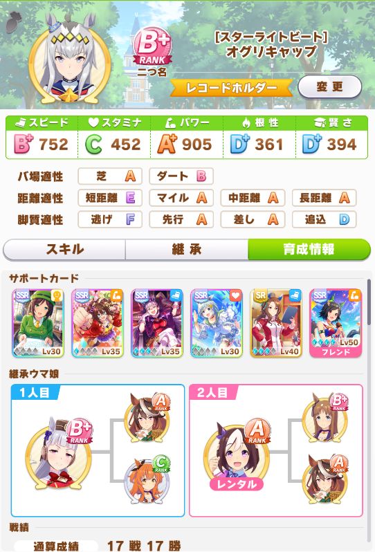 因子もスピード6パワー2、さらに親因子で地固め2も付いてて良い感じの結果に。