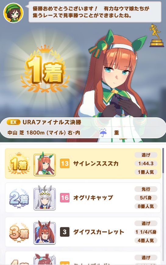 URA決勝でその弱点がモロに出てしまった為4度走って全く勝てず終了…
