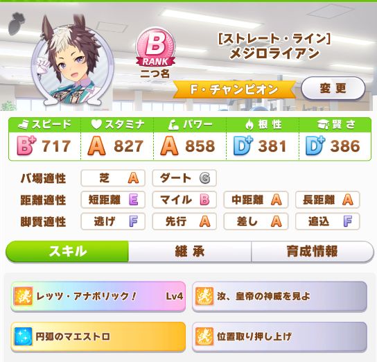 クラシック級でマエストロは共同通信杯で取得。因子継承でURAシナリオ1回。