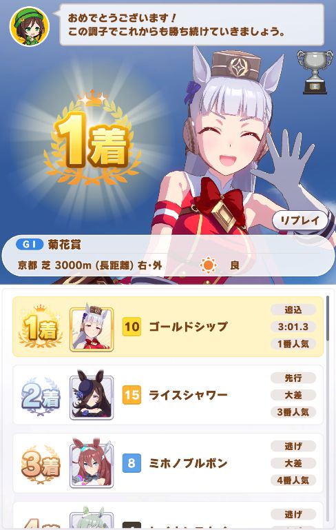菊も外枠でコーナー回復とペースキープのみで、前者は発動しなかったが先に抜け出したルドルフを差し切って勝利