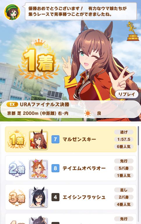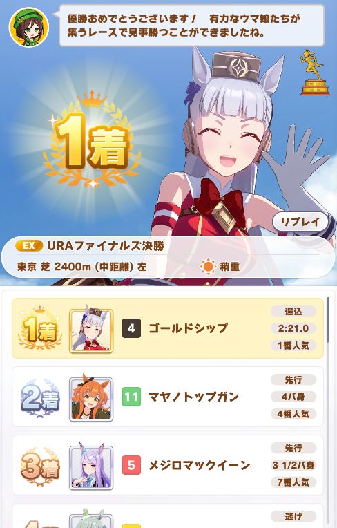 URAは、度々モブロックされかける危うい場面もあったが、固有スキルが強いおかげか無事抜け出しての勝利。ノーコンクリア!