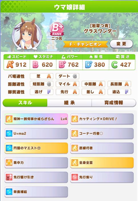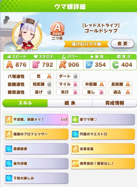 他スキルは9月にたづなさん、11月にオールボディオールゴースト、マエストロもシニア5月に無事獲得したが食いしん坊、コンセントレーションは獲れず