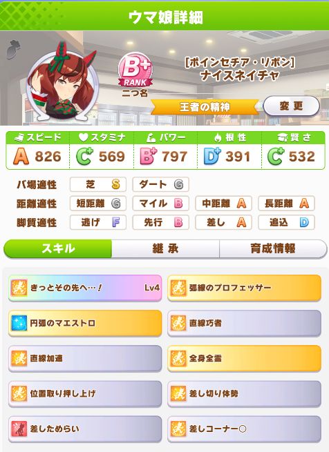 クラシック級は皐月賞5バ身差、ダービーはコーナー回復が発動しなかったがステータスは十分で5バ身差