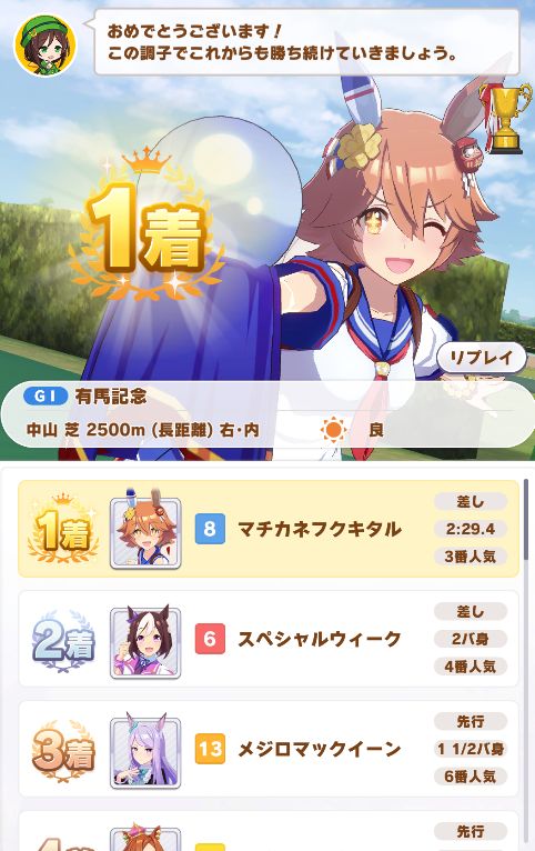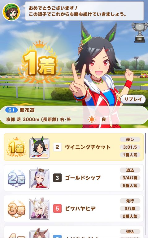 菊花賞の頃にはスタミナトレーニングが虹ってきたおかげで、急上昇したスピードに追いつく位にスタミナが盛れて内枠もゴルシとの競り合いを制して勝利