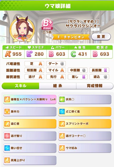 スタミナが多めなので長距離用に。パワーを入れてなかったせいもあって差しにしてはパワー足りてない印象。