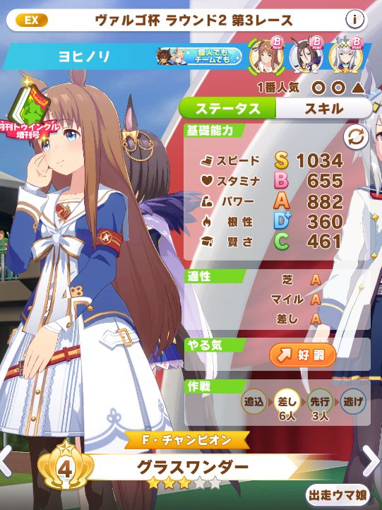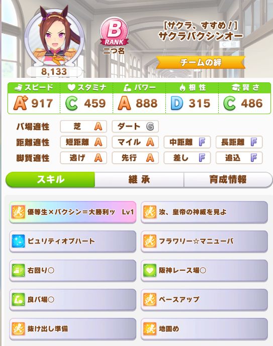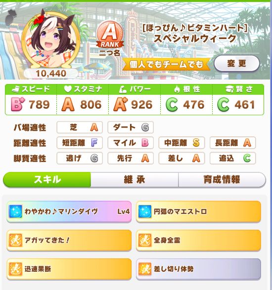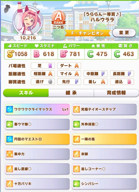 序盤でだいぶ躓いて、レースに多めに出す形に変更した為ステータスは下振れ