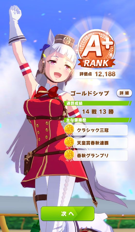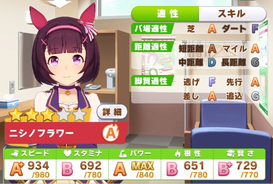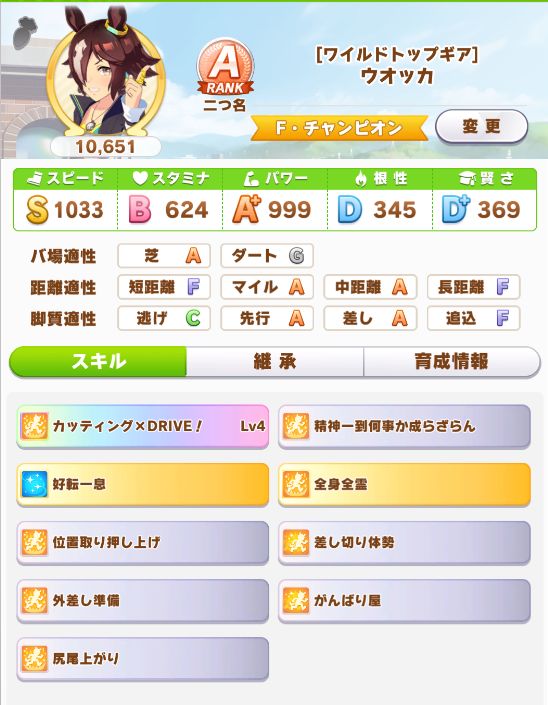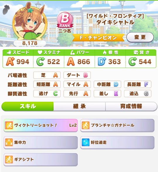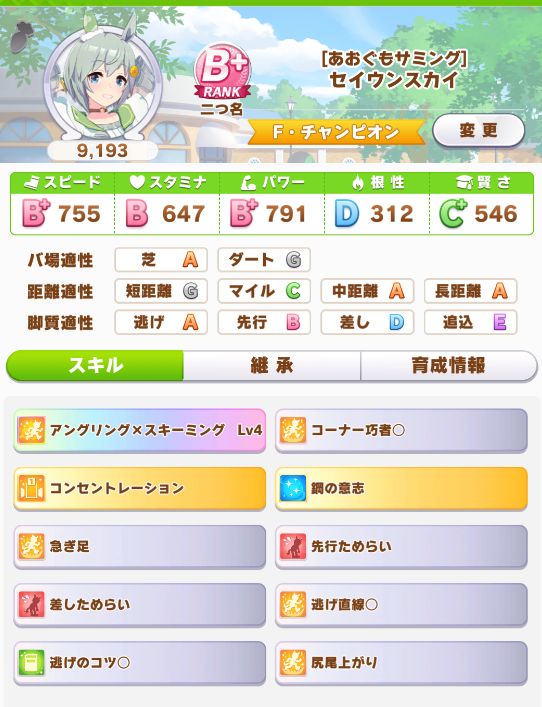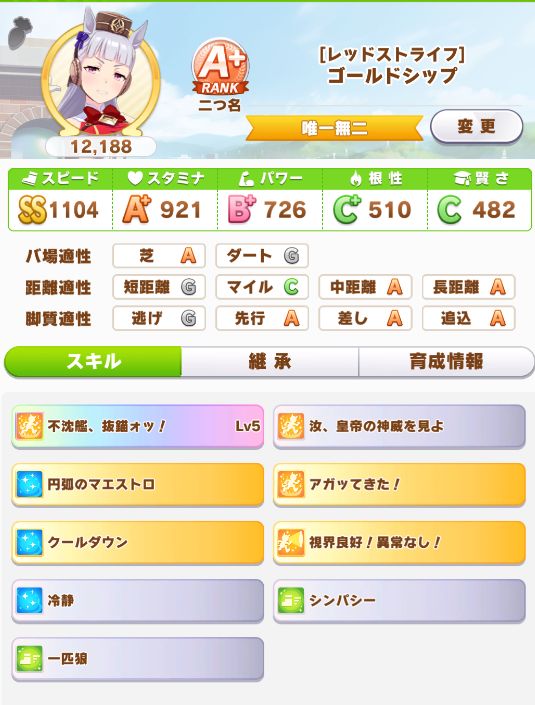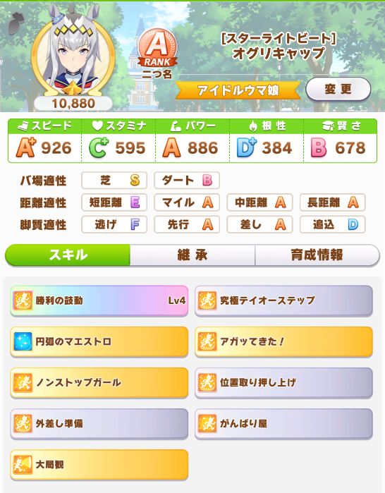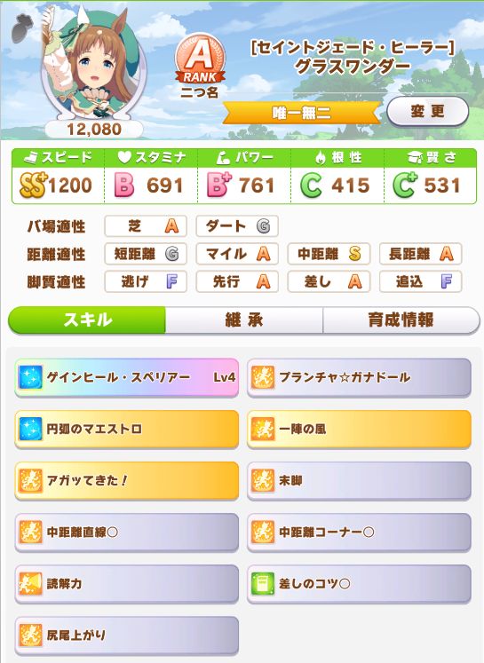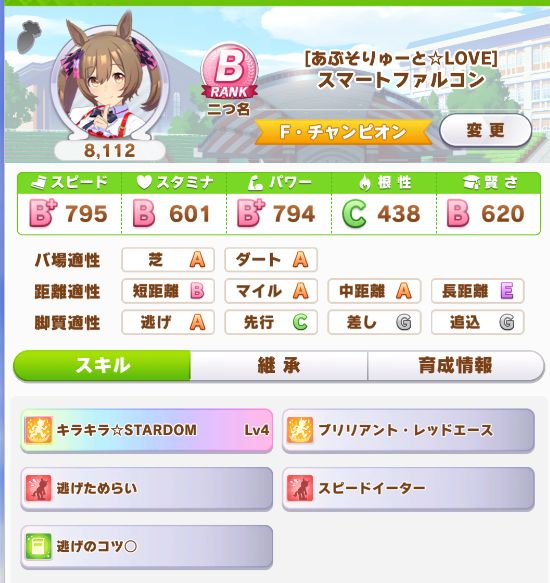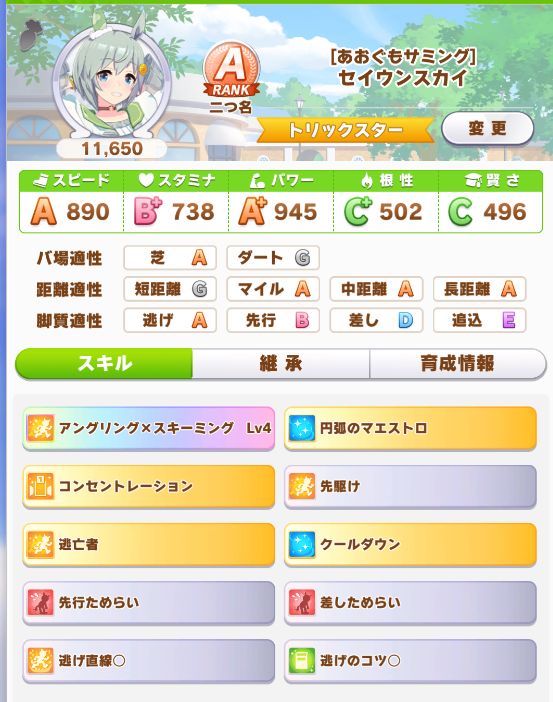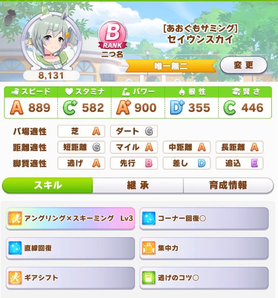 差し脚質らしいスキルは獲れたものの、ステータスはもうちょい上振れたかった。