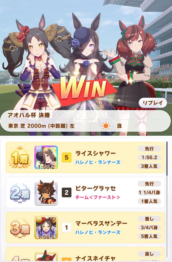 アオハル杯決勝はニシノちゃんがAランク入りしたのもあって無事優勝。