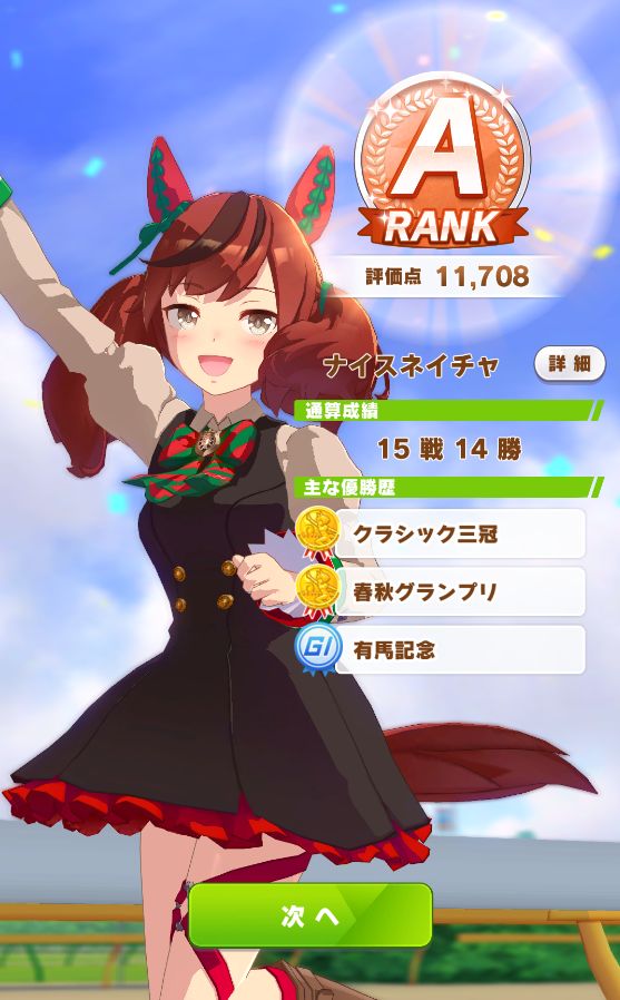 アオハル杯決勝、シーキングザパールがAランク(距離適性上げればオールマイティじゃない?)の中、当のネイチャはスピスタが全然上振れ無い状態ながら無事優勝。