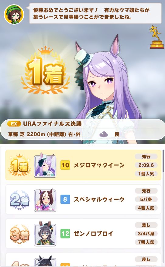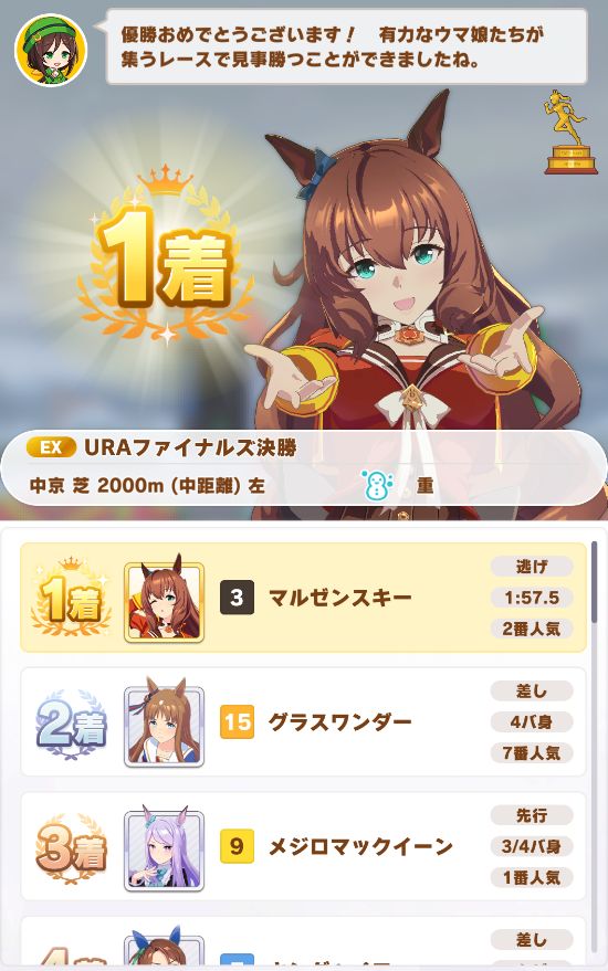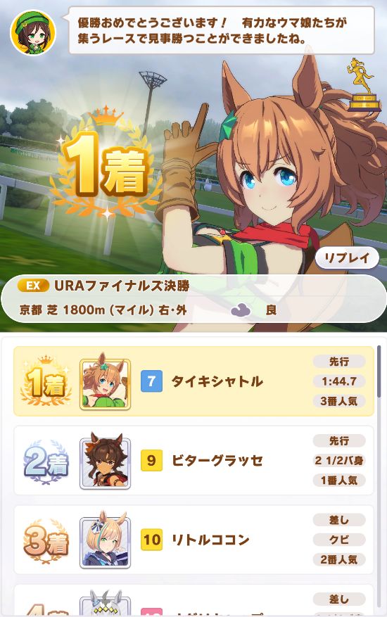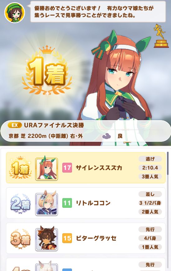 アオハル杯は今回も優勝出来て、URAの決勝も今回はビターとリトルの2人を抑え無事ノーコンクリア。