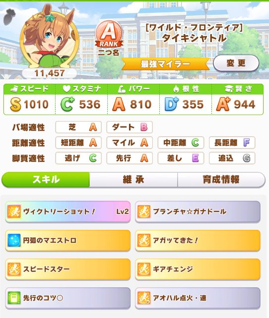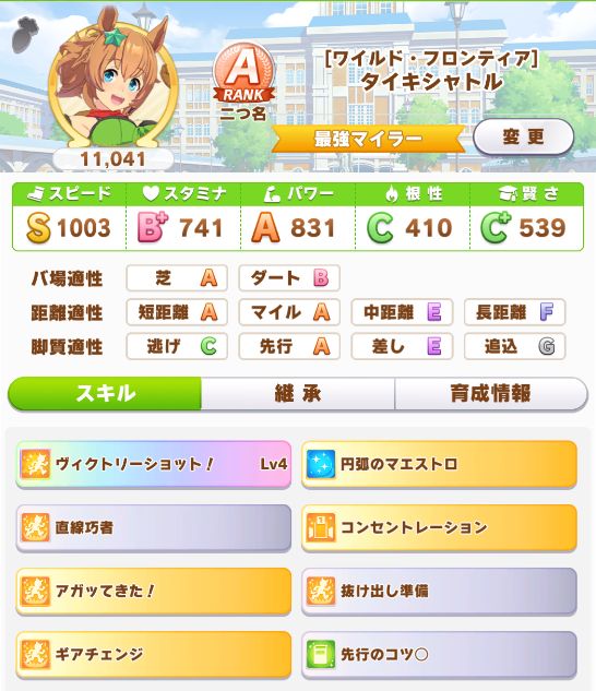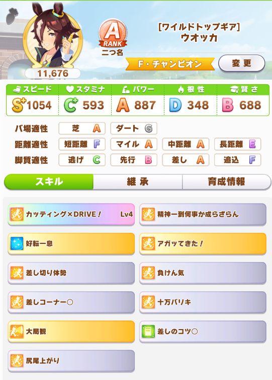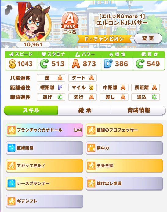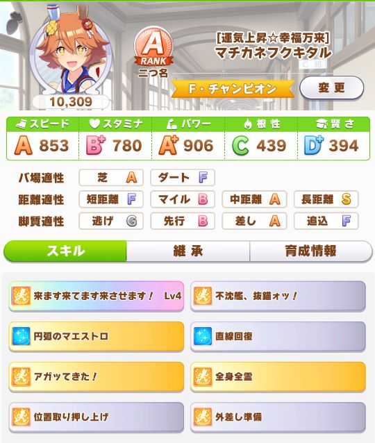 因子継承で中距離Sとなったこともあって、中距離向きのステータスに。