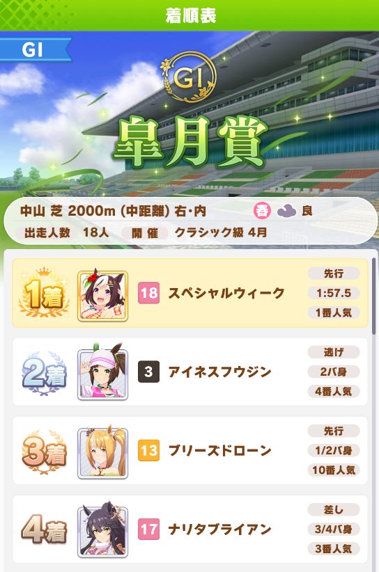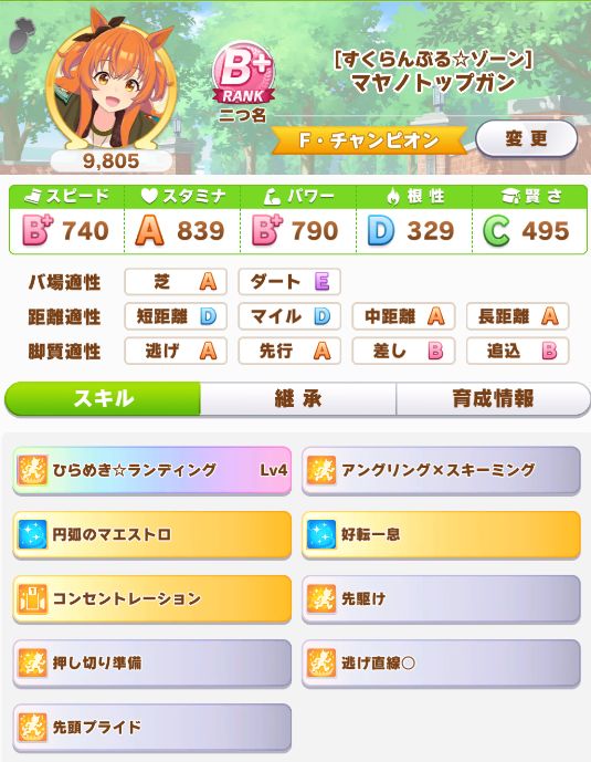 スピードとスタミナが揃った状態だったので、マエストロではなくコーナー回復のみ取得して春天に出走、2着で乗り切る。