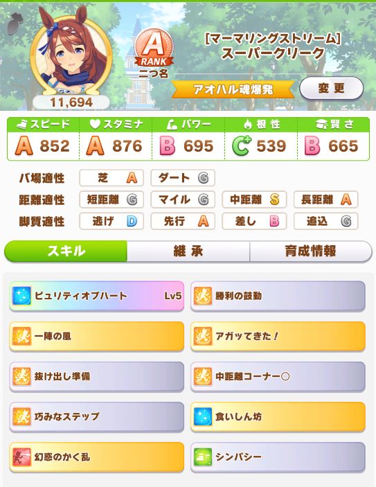 …が、パワーを無視して育成してた事もあって、いざテスト走行すると出足が鈍く序盤の位置取りが鈍い印象。やっぱりパワーを強めに盛るべきか。