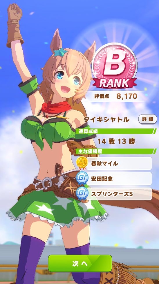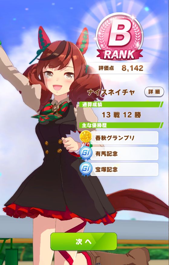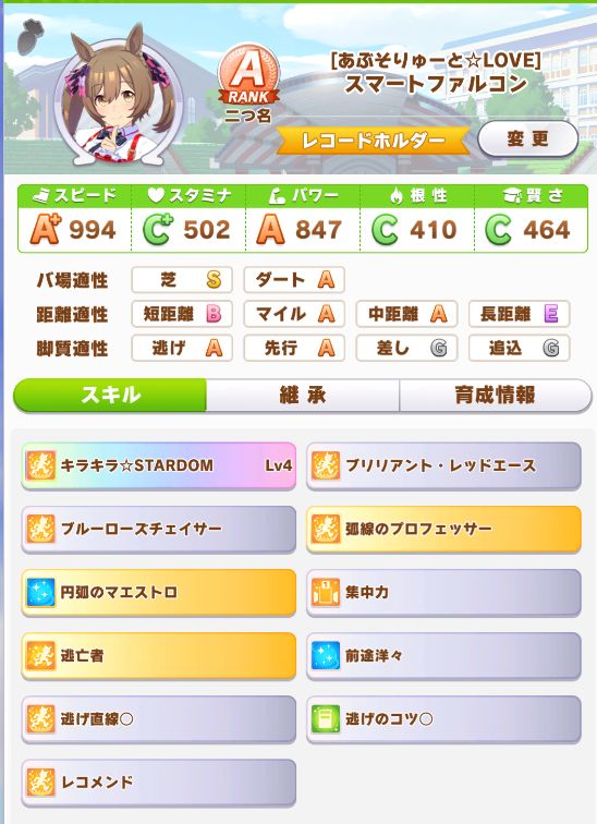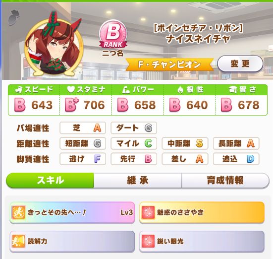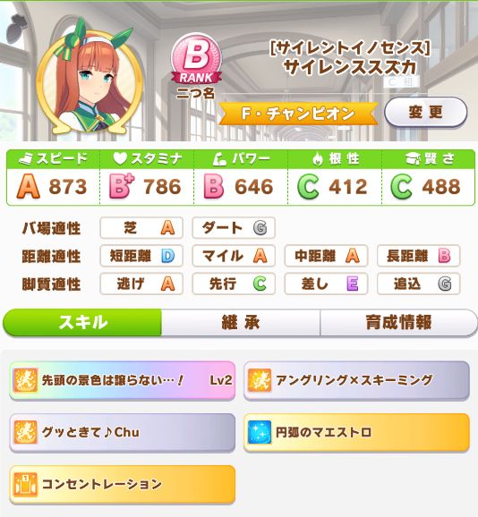 自分の育成では初のオールB以上に。ついでに因子継承で中距離Sなのも良い感じに。