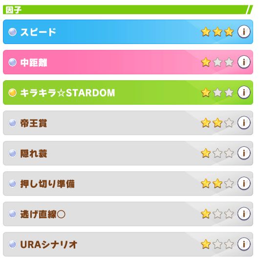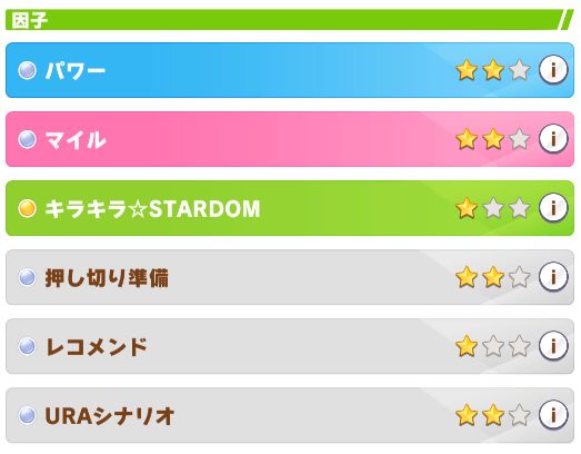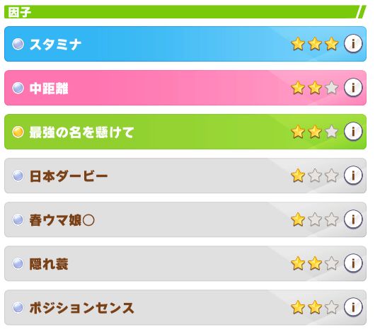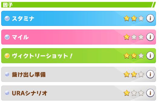 因子はそこそこ。ファン数の少ないレースを走る必要があった為、ステータスが上げづらい印象