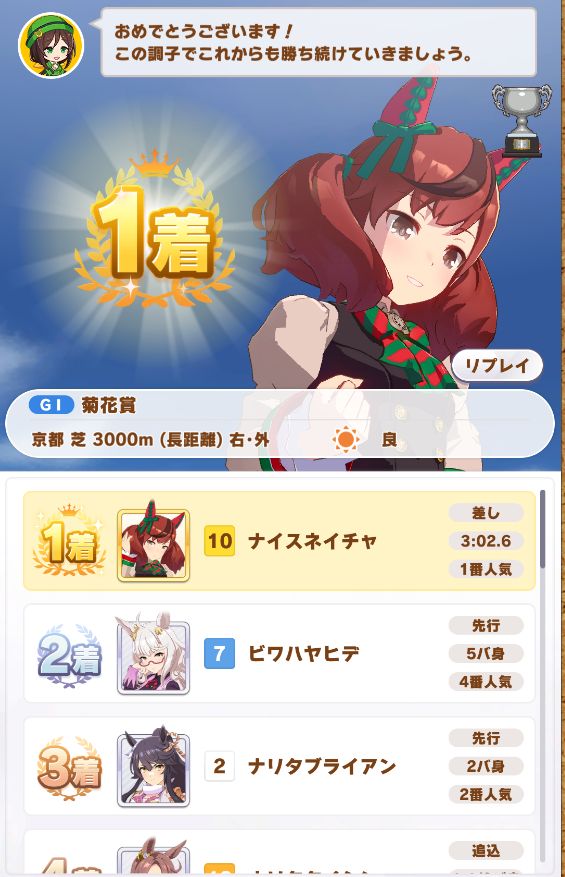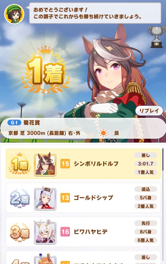 ステータスは下げたくなかったので、トレーニングメインで菊花賞は無事勝ち。