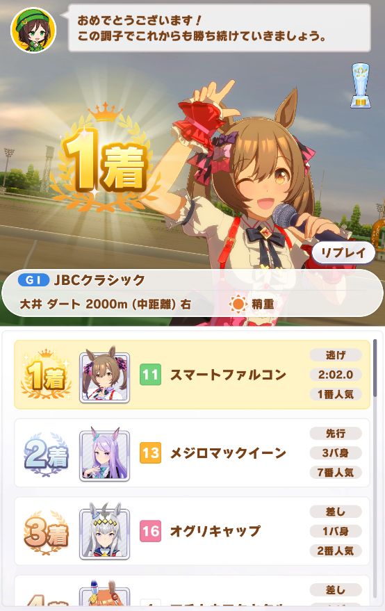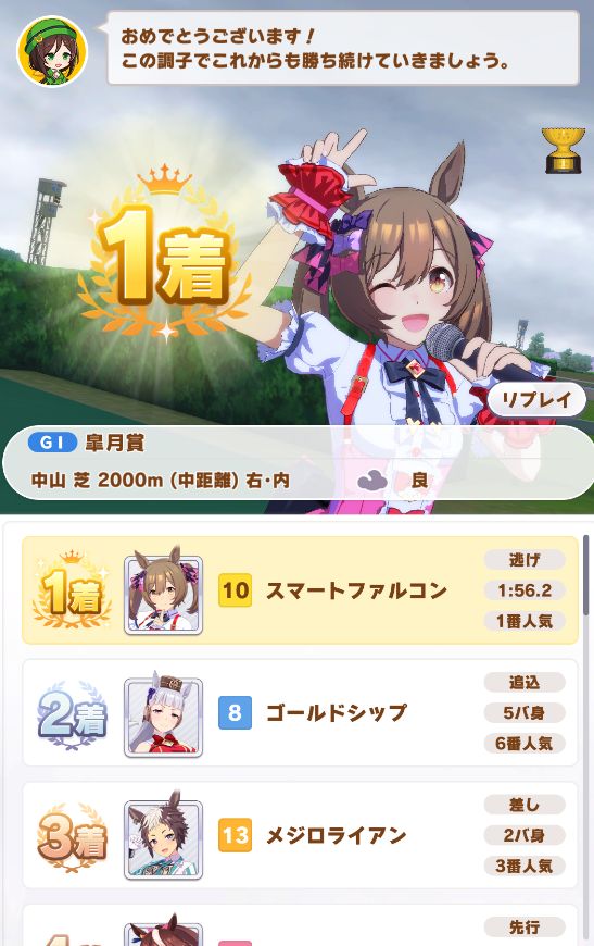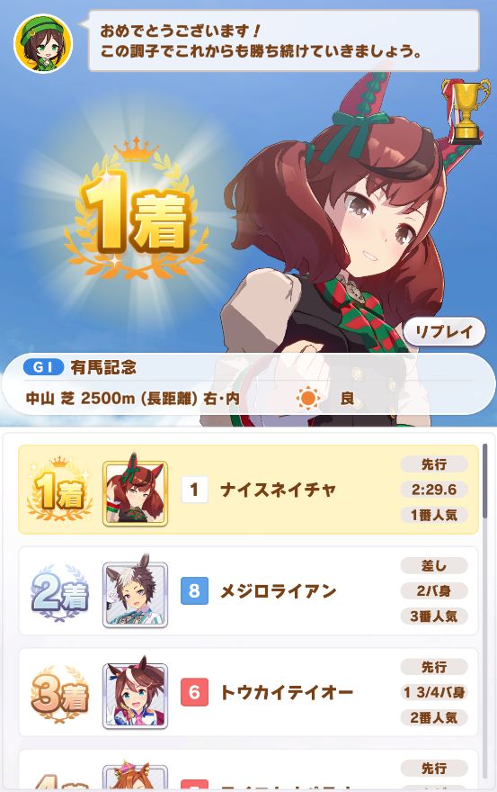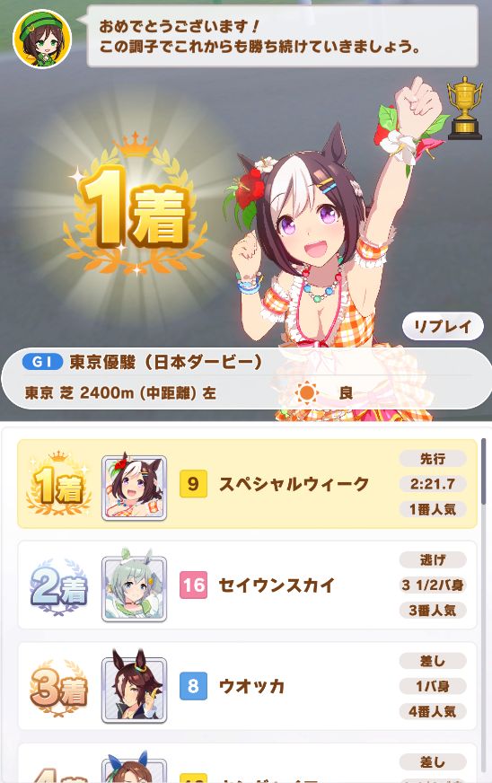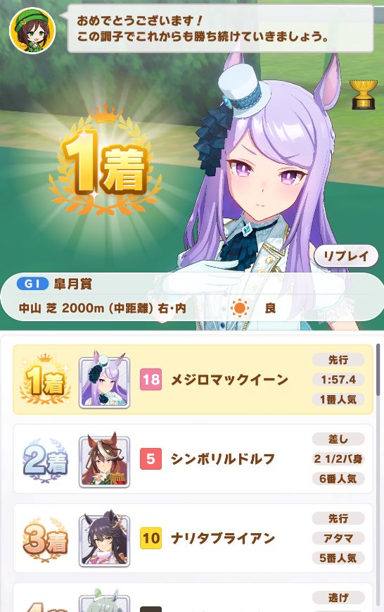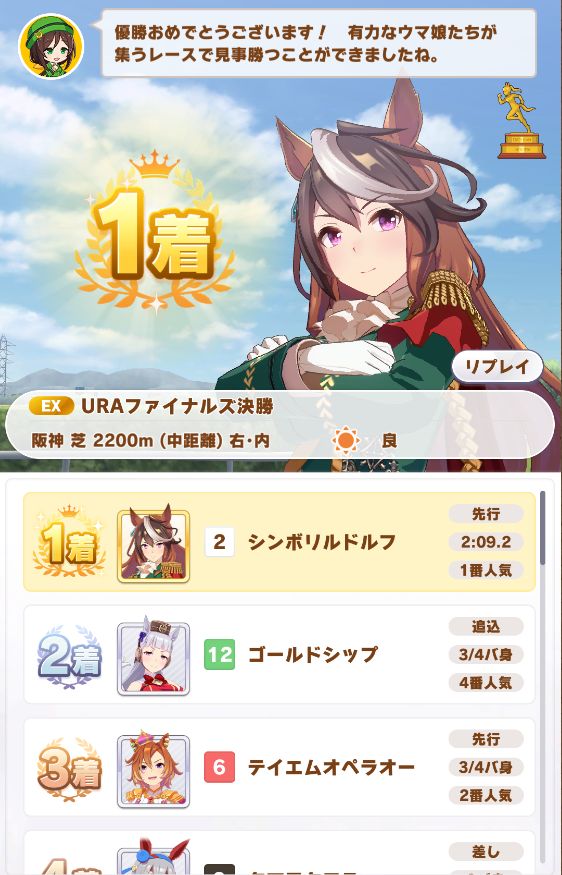 ついでに出たジャパンカップは内枠で先行脚質が多かったので逃げたら初めて固有スキルが発動したもののルドルフに差し切られて2着