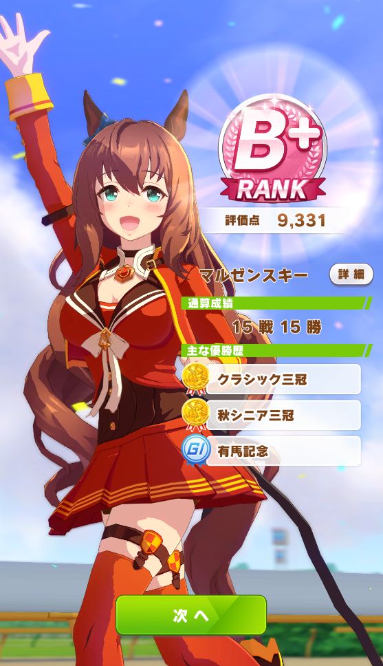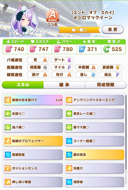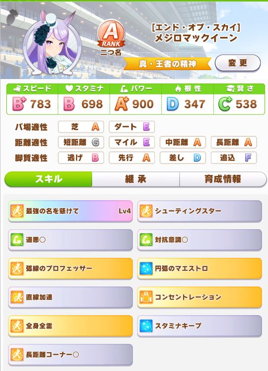 マエストロを取ったらそれだけで終わってしまうのは勿体ないので、取れたら取りたいと狙っていたルドルフ、テイオーの固有スキルを取ってギリギリBランクで育成完了