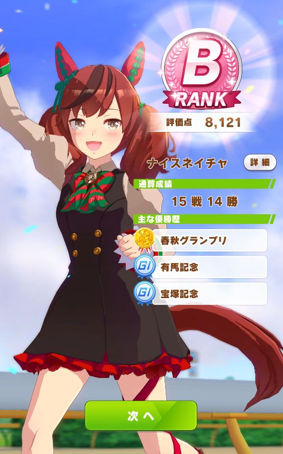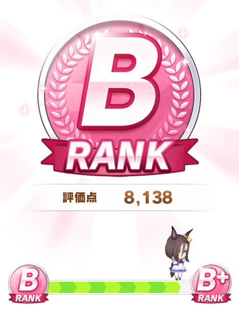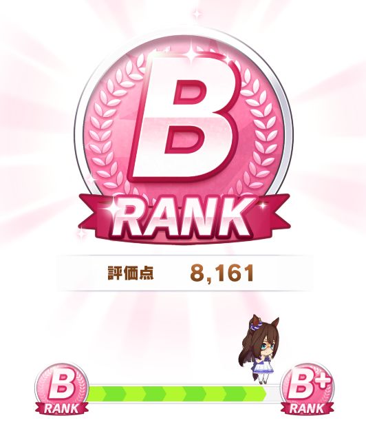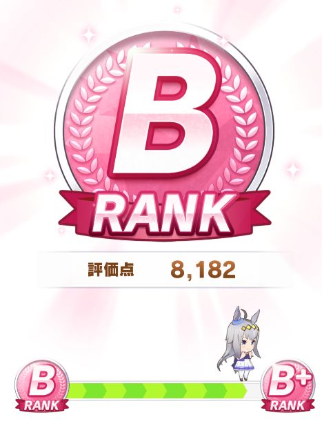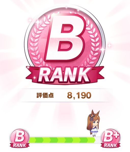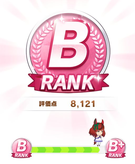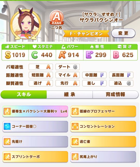 終了時点で評価点7509。そこで抜け出し系、末脚、それとウインディちゃんがくれた逃げためらいデバフを付けてBランクに収める。