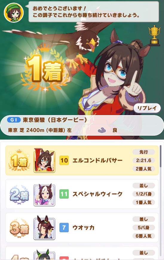 ダービーは先行で、スタミナがギリギリの為か固有スキルが出ずもギリ勝利。