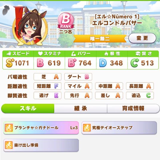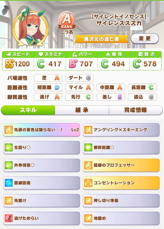 グラスはスキル自体は高確率で出るものの、最終直線の時点で後方で届かない展開が多く、1回勝利した時もわりと前方にいて固有スキルが出ない状態で勝ったものなので、差しは厳しいのだろうか。