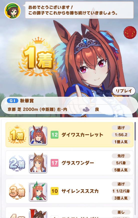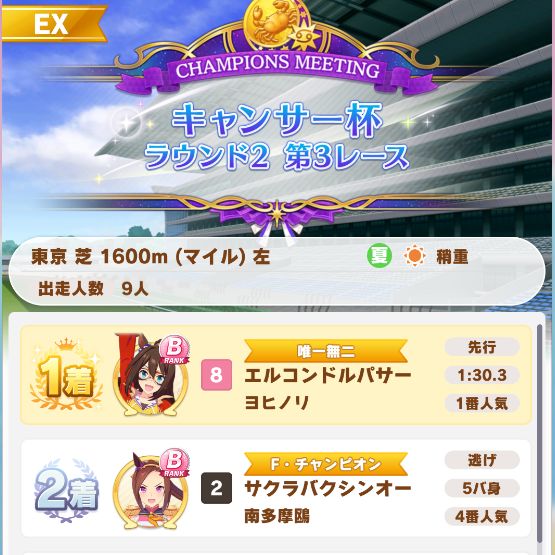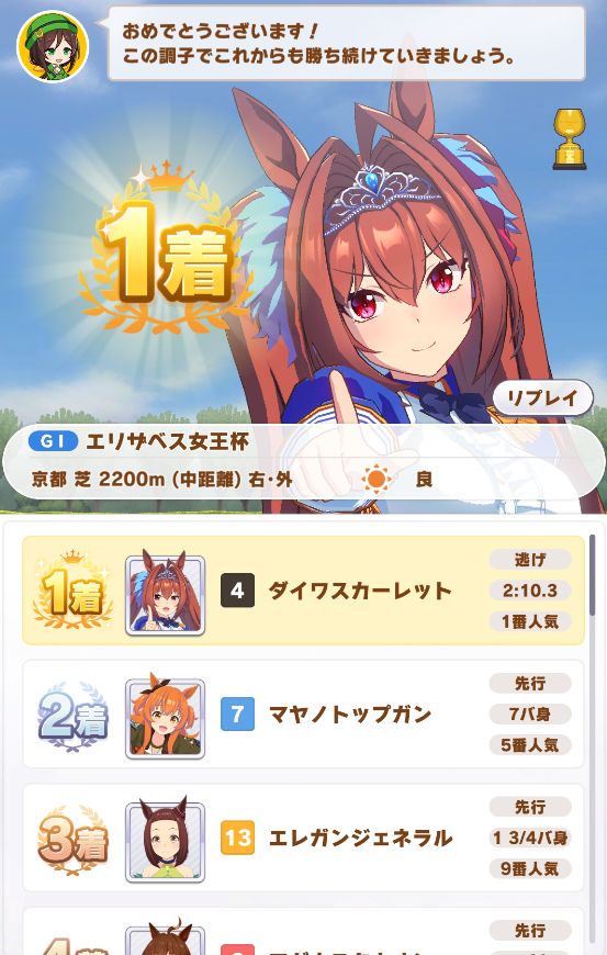 結果はセイちゃん3勝のみ。エアグはスキル出ても2着まで。キングに至っては最後まで固有スキルを発動しなかった模様。