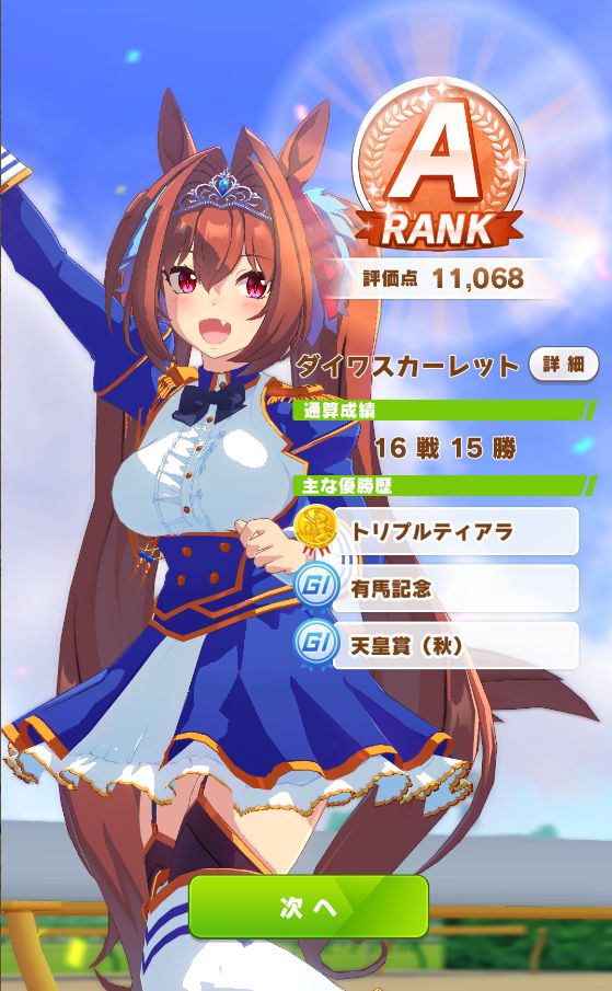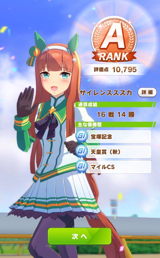 URAシナリオが出た事もあって終了時点で8673だったので、チーム競技場マイル用にスキルを取って、ダスカで初Aランクで終了。