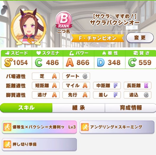 バクシンは固有スキルが2番手で発動する為か、セイちゃんとは逆に誰かの後ろを追走して勝つ印象