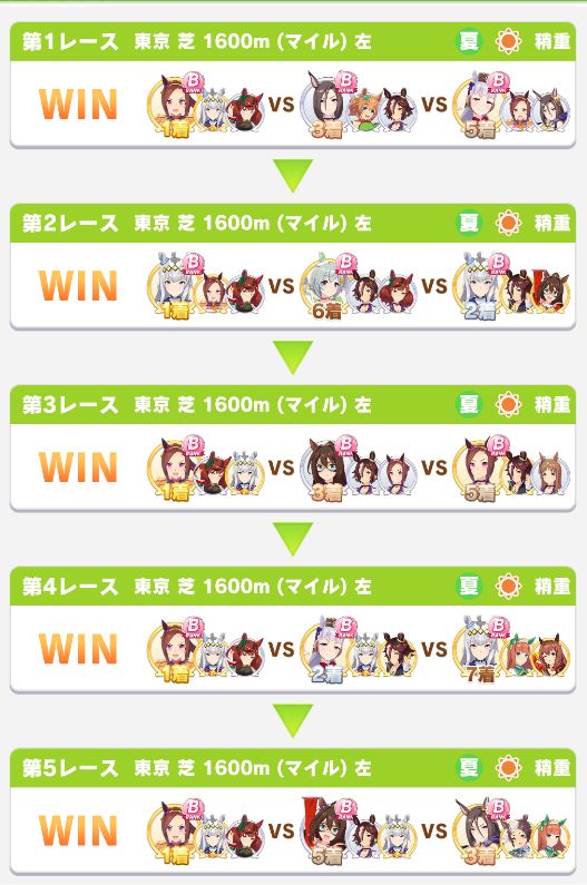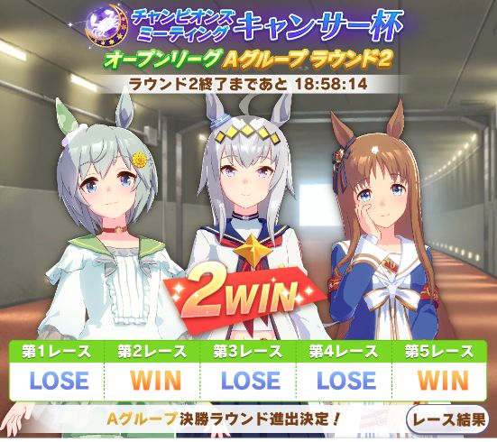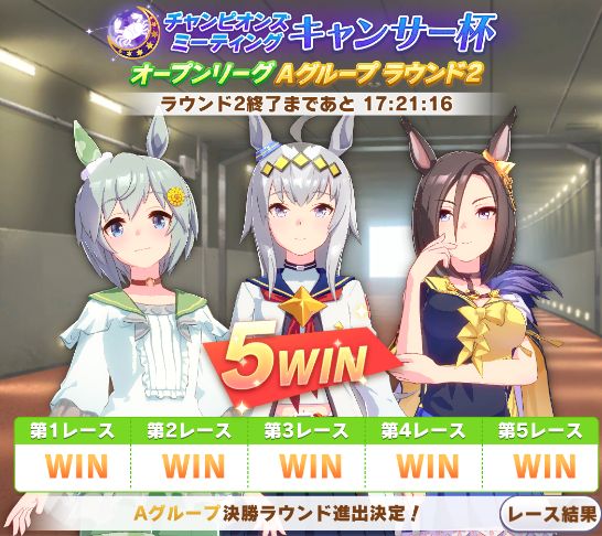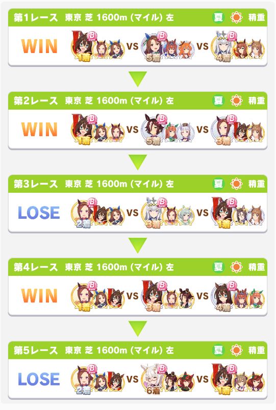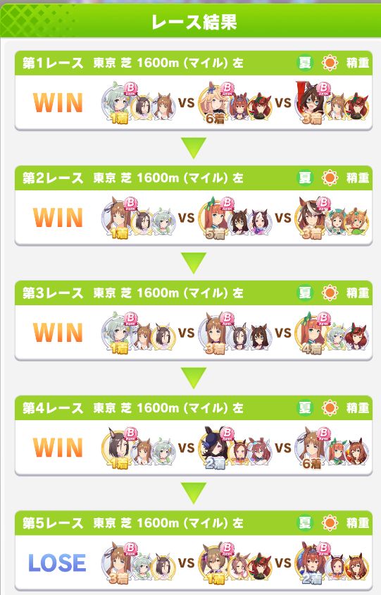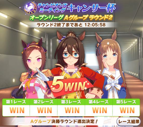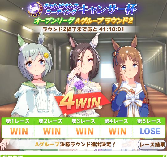 4戦までは、セイちゃんが前に出られない展開の場合、エアグとグラスの二人がフォローして勝っていたが、5戦目は相手が強かった。蓋ファル子、デバフネイチャ、追込タイシンの完璧な布陣。