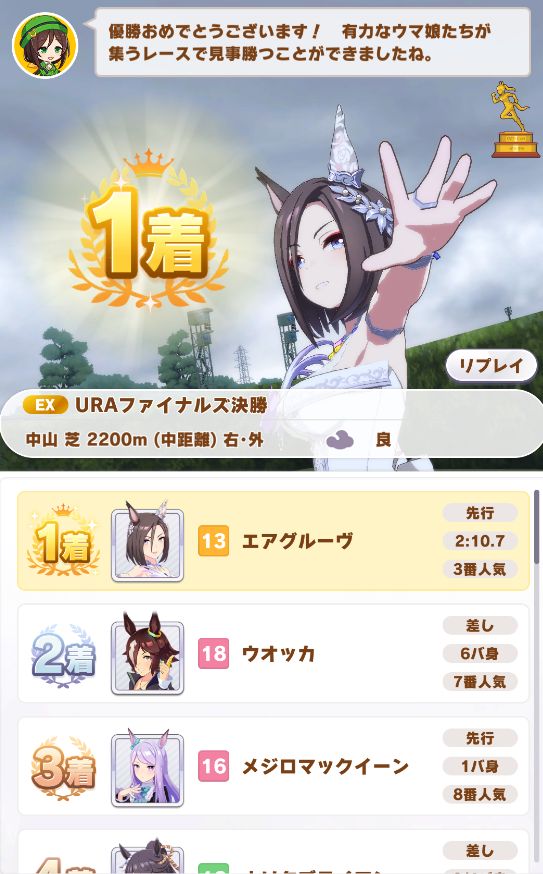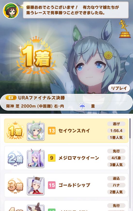 寝不足、偏頭痛引くわURA決勝で1コンするわの展開ながら