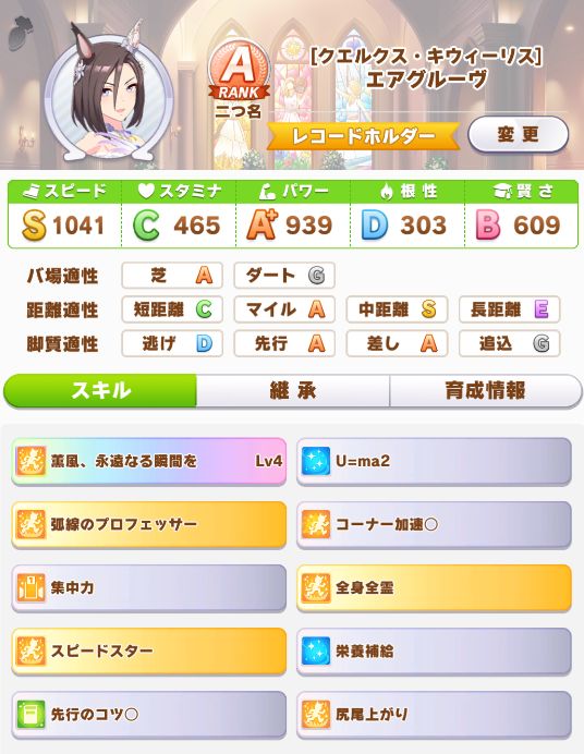 前回のエアグルーヴほどは上振れ無かったが、スタート系のスキルも取れてマイル戦に良い感じに。