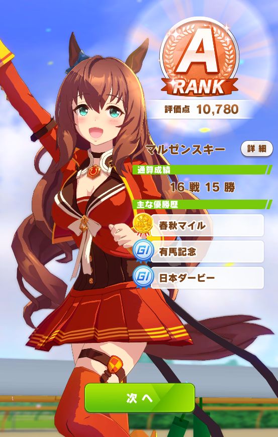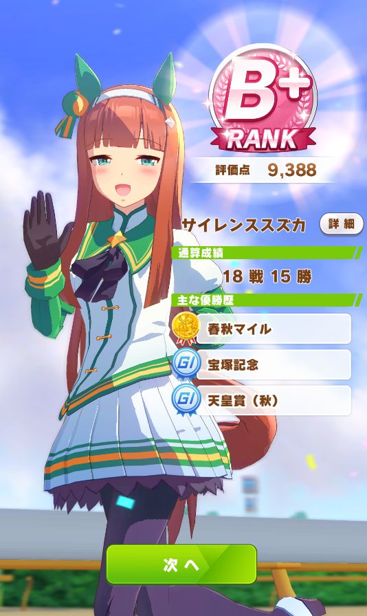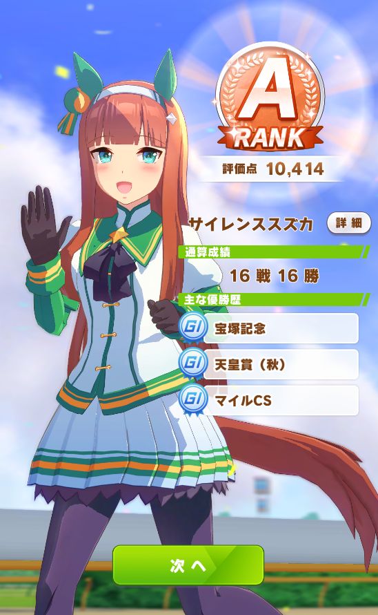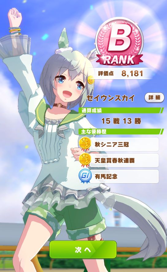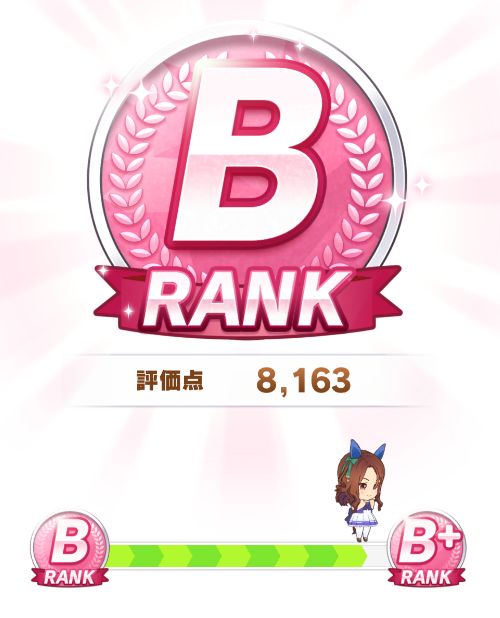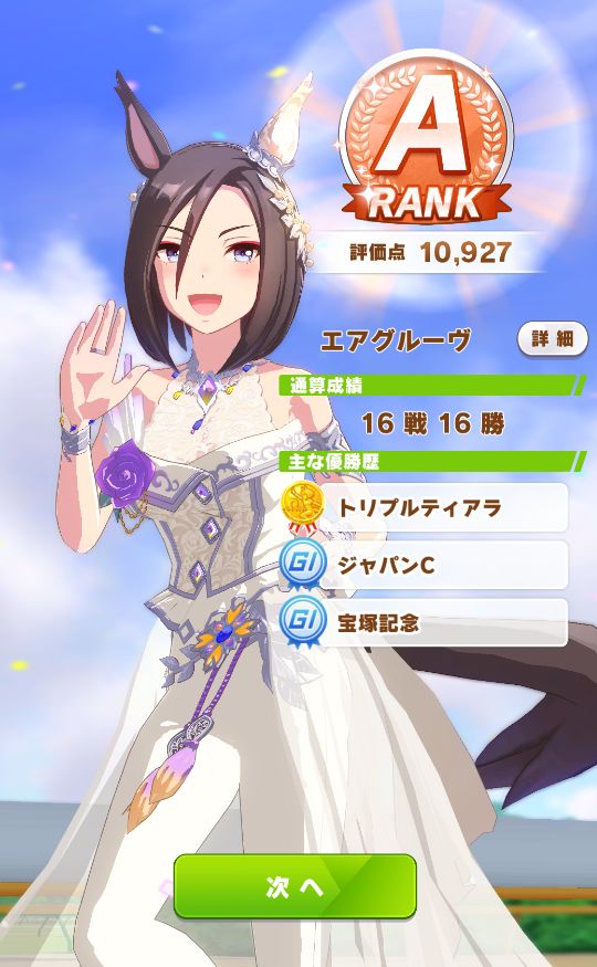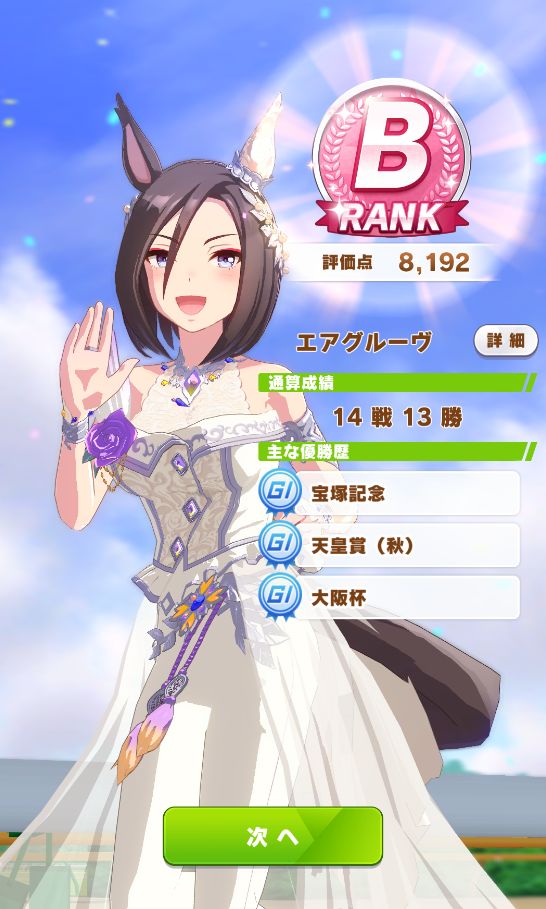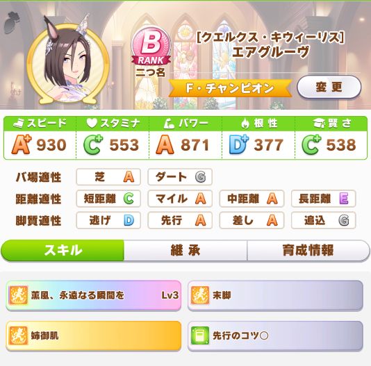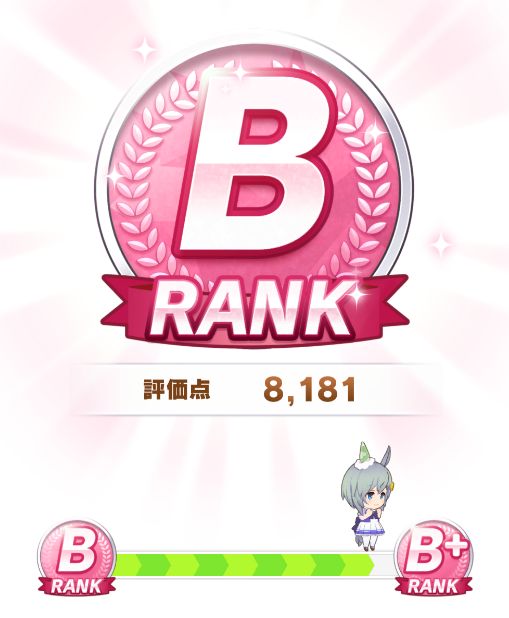 終了時点で評価点7700くらい。そこで新衣装エアグルーヴが取得出来るスキルの姉御肌と末脚だけ取ってギリギリBランク。