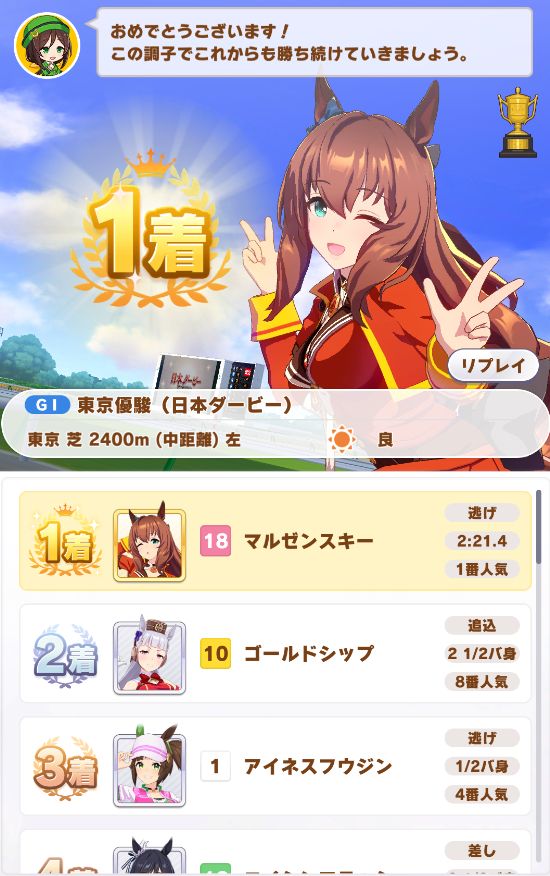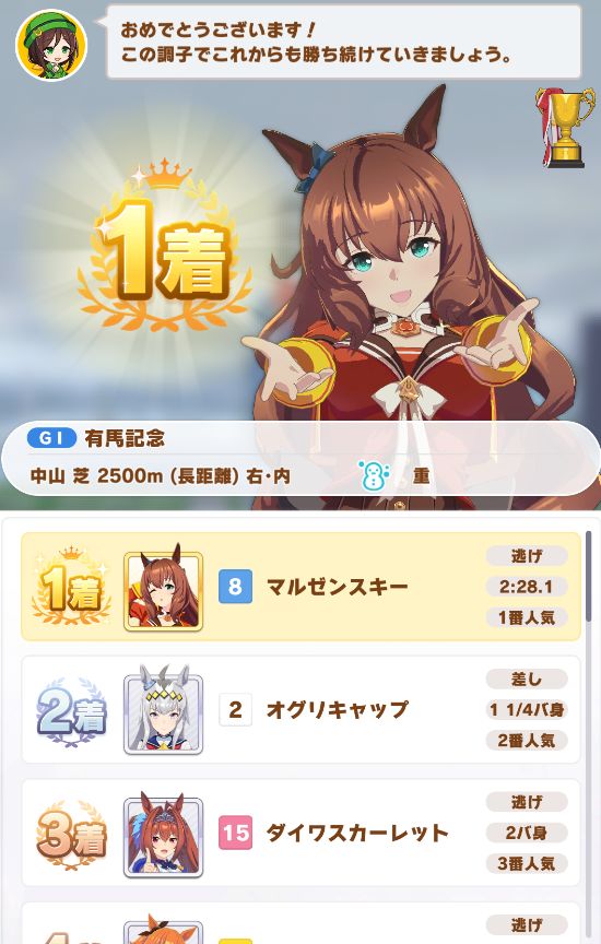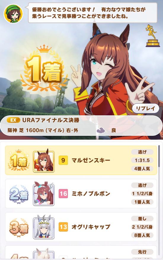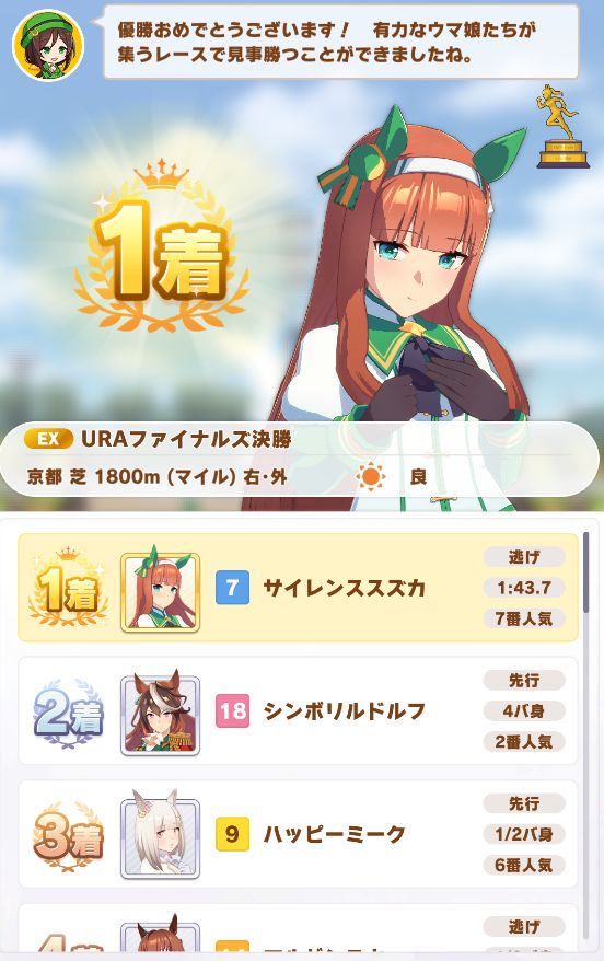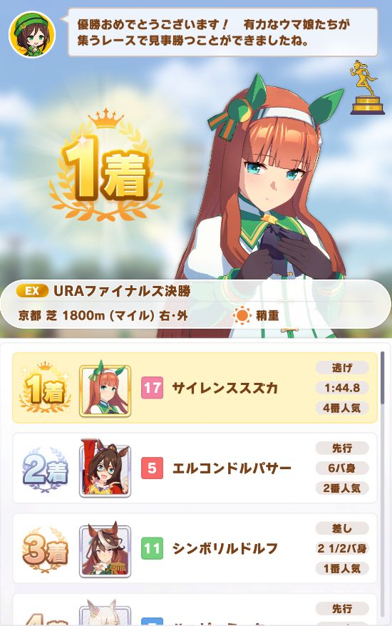 最後の直線でゴボウ抜きしての勝利。まさかノースキルでクリア出来るとは