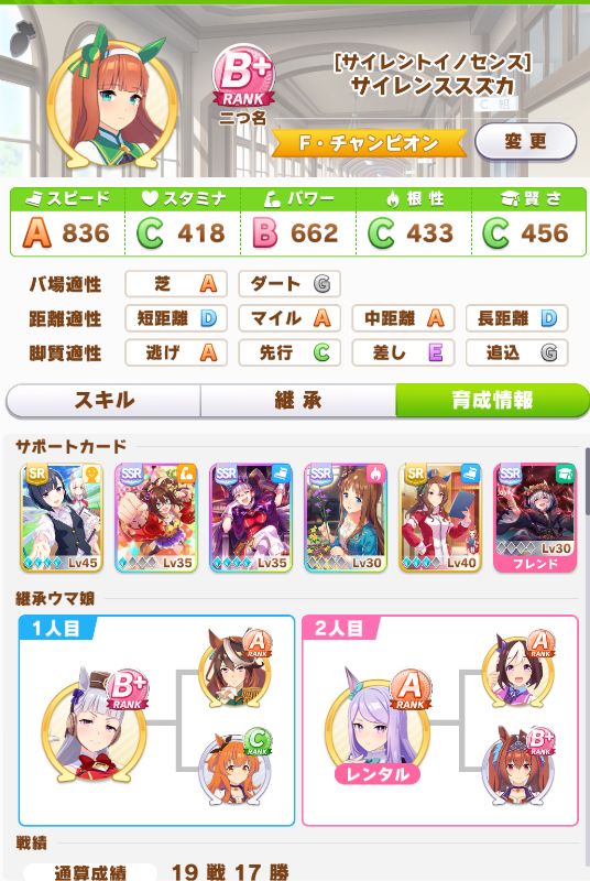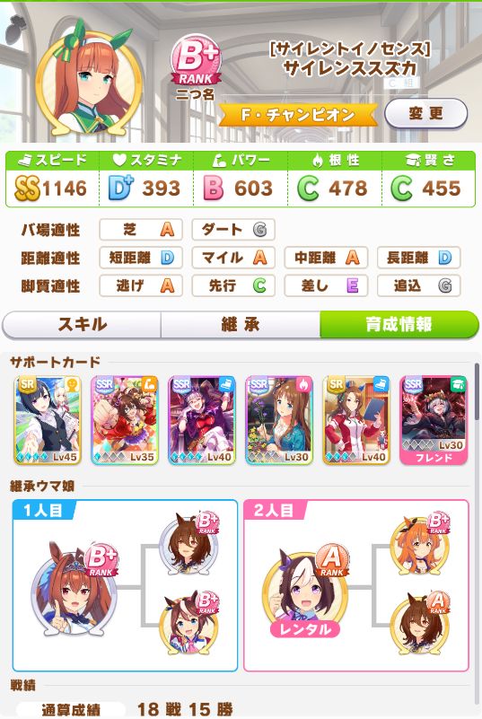 スズカが因子をスピードに寄り過ぎたせいで早々にカンストしたので、サポカはほぼ同じで因子だけスタミナとパワーに振って育成