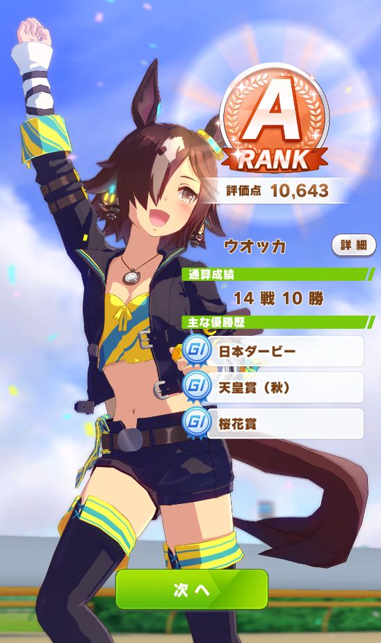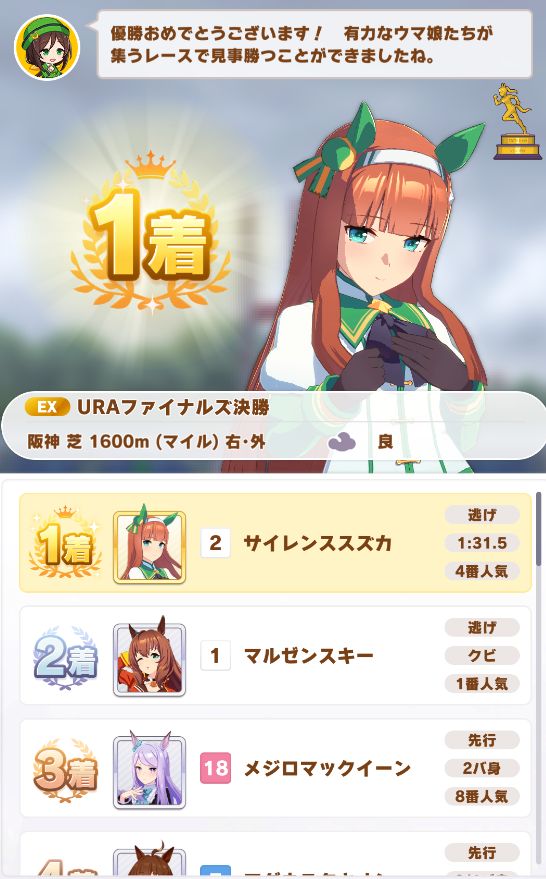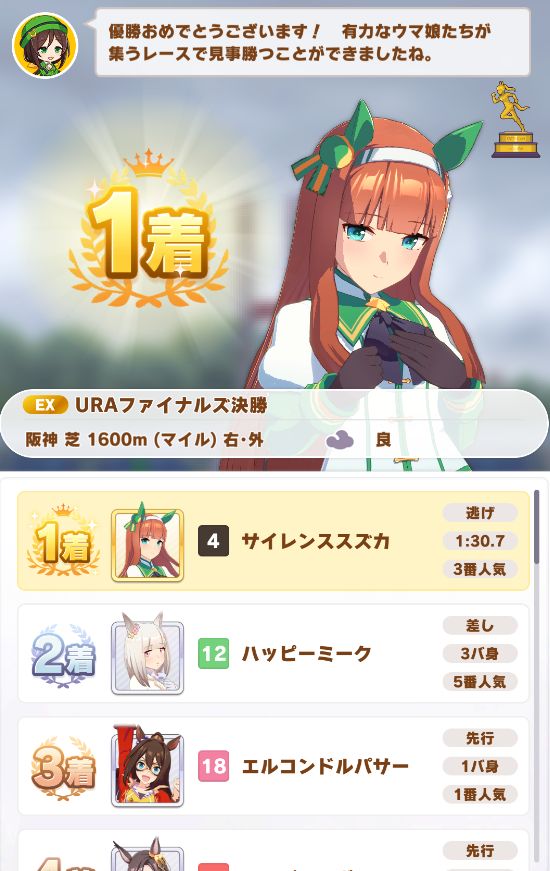 URAはマイル・中距離共に4戦ずつだったがマイルが選ばれ、全て差し切り勝ちでノーコンクリア